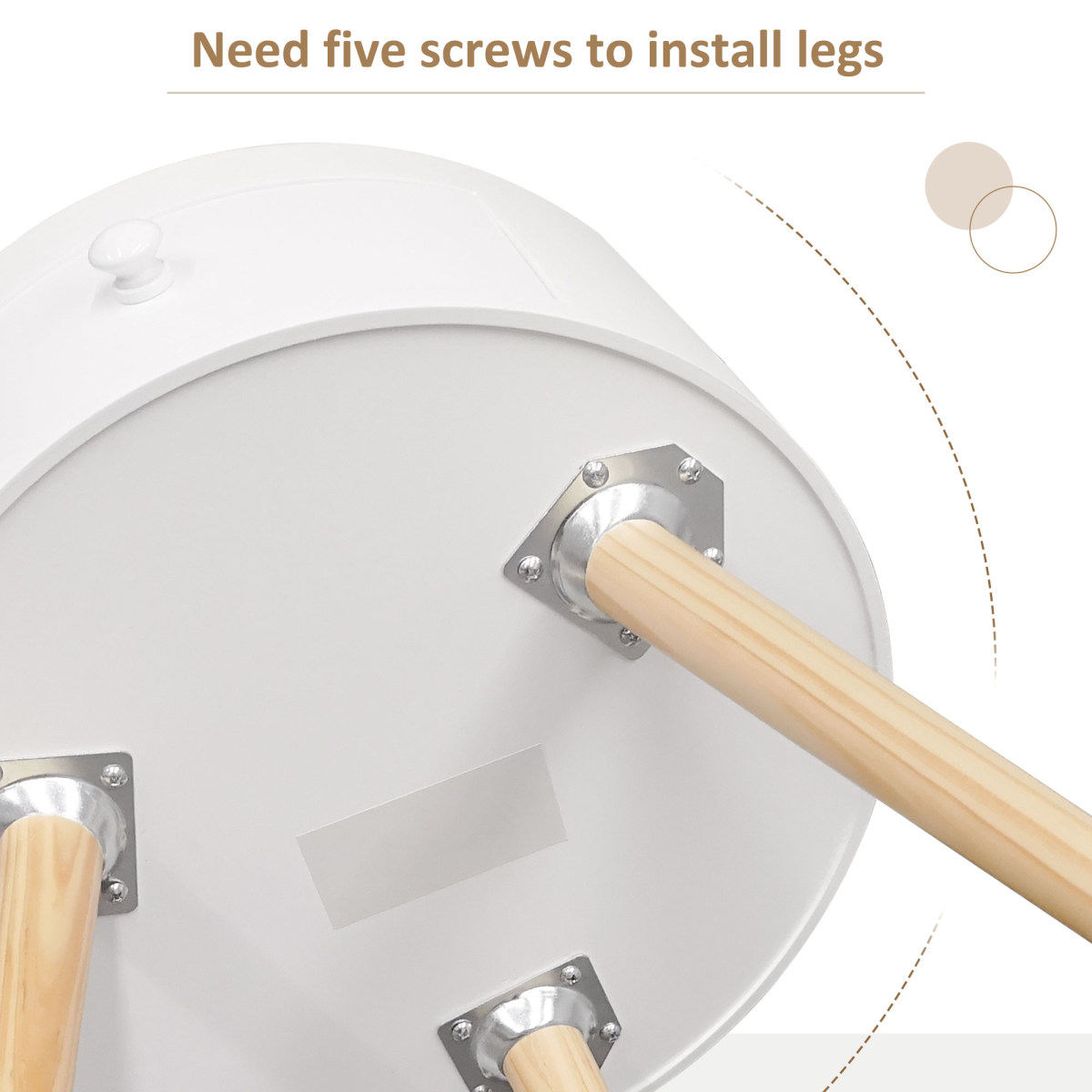 Beautiful sleek line in white finish and non-sharp, kids-safe round edges for a marvelous feel Large round surface for a spacious and comfortable usage Designed with 3 strong wooden legs for durability and stability Ideal for the living room, bedroom, office, waiting room, as a corner table, coffee table Pull-out drawer provides space to keep small essentials Assembly required.