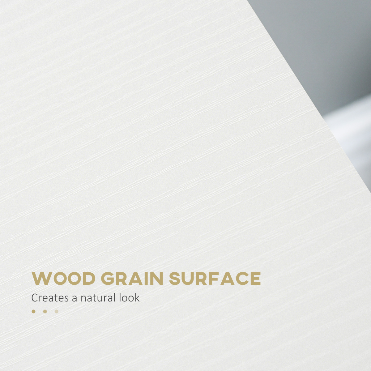 Extra storage space underneath the tabletop store smaller office supplies, such as pens, sticky notes, and staplers