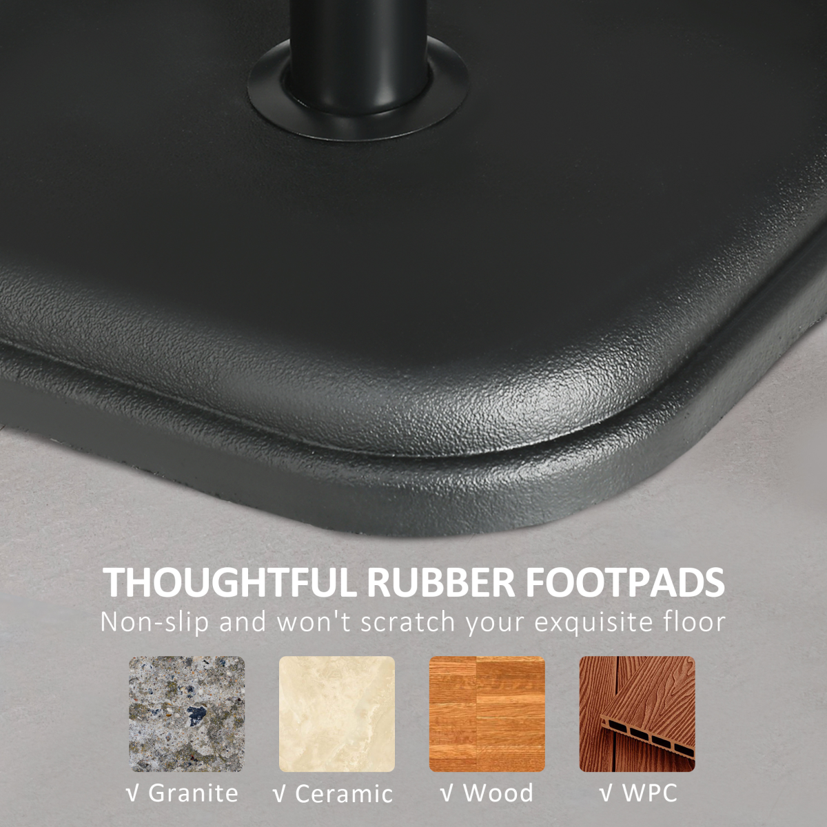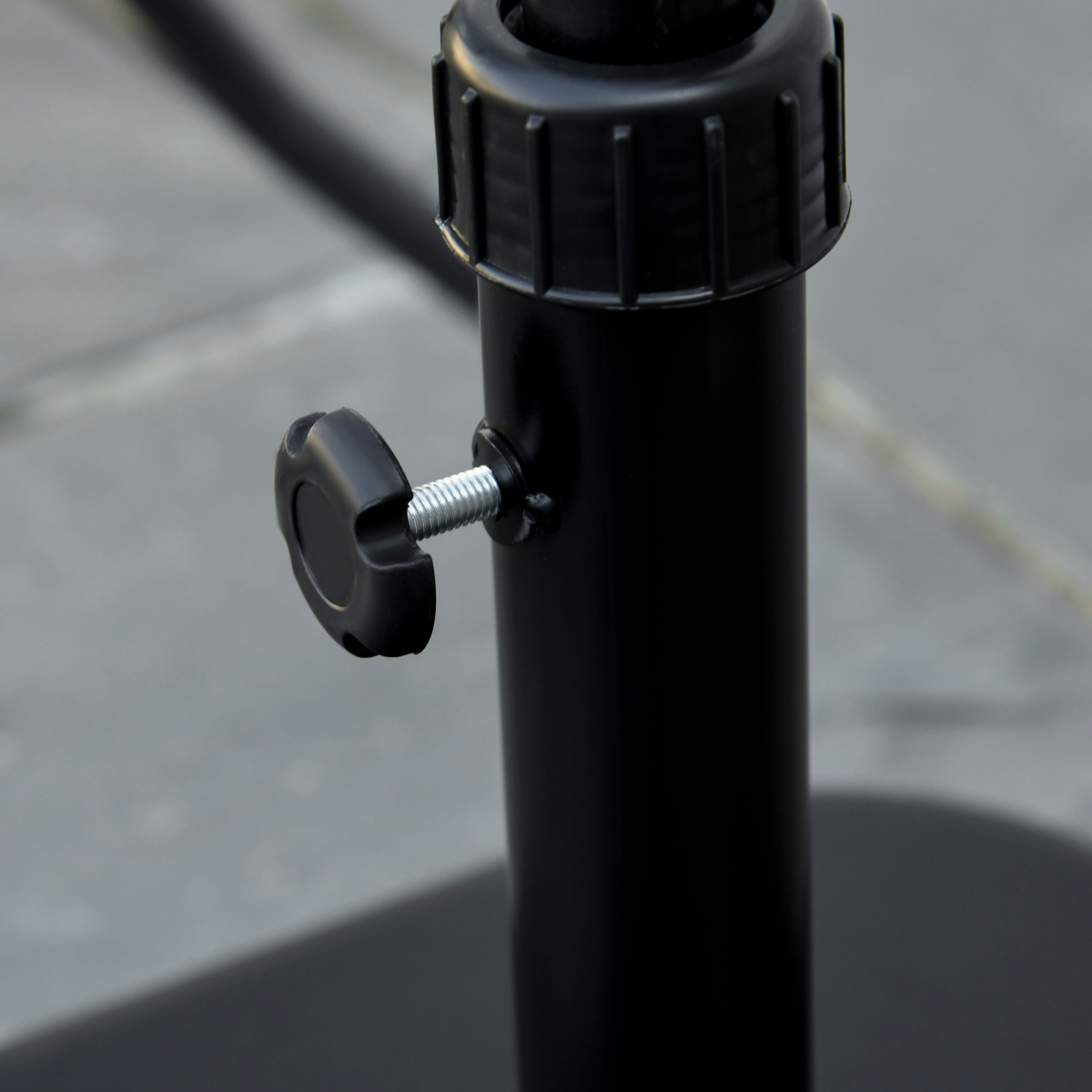 For 32mm-38mm diameter poles, between table design: Parasol base is specially for use with middle-hole tables. Parasol canopy sizes up to 2.5m diameter. Includes skus X-84D-017 and X-84D-097. Measure pole and canopy before purchase.Tightening knob: Easy to adjust the wheel on this outside umbrella stand, keeping your umbrella standing steady in place.Plastic shell, with concrete filling: Parasol base is tough and sturdy - holding your umbrella in place. This umbrella base is suitable for outdoor use.Rubber foot pads: Extra friction to the floor, this patio umbrella stand keeps in place even more.Dimensions: 31H x 36L x 36Wcm. Pole 26.5H x ?4.8cm. Easy to assemble.