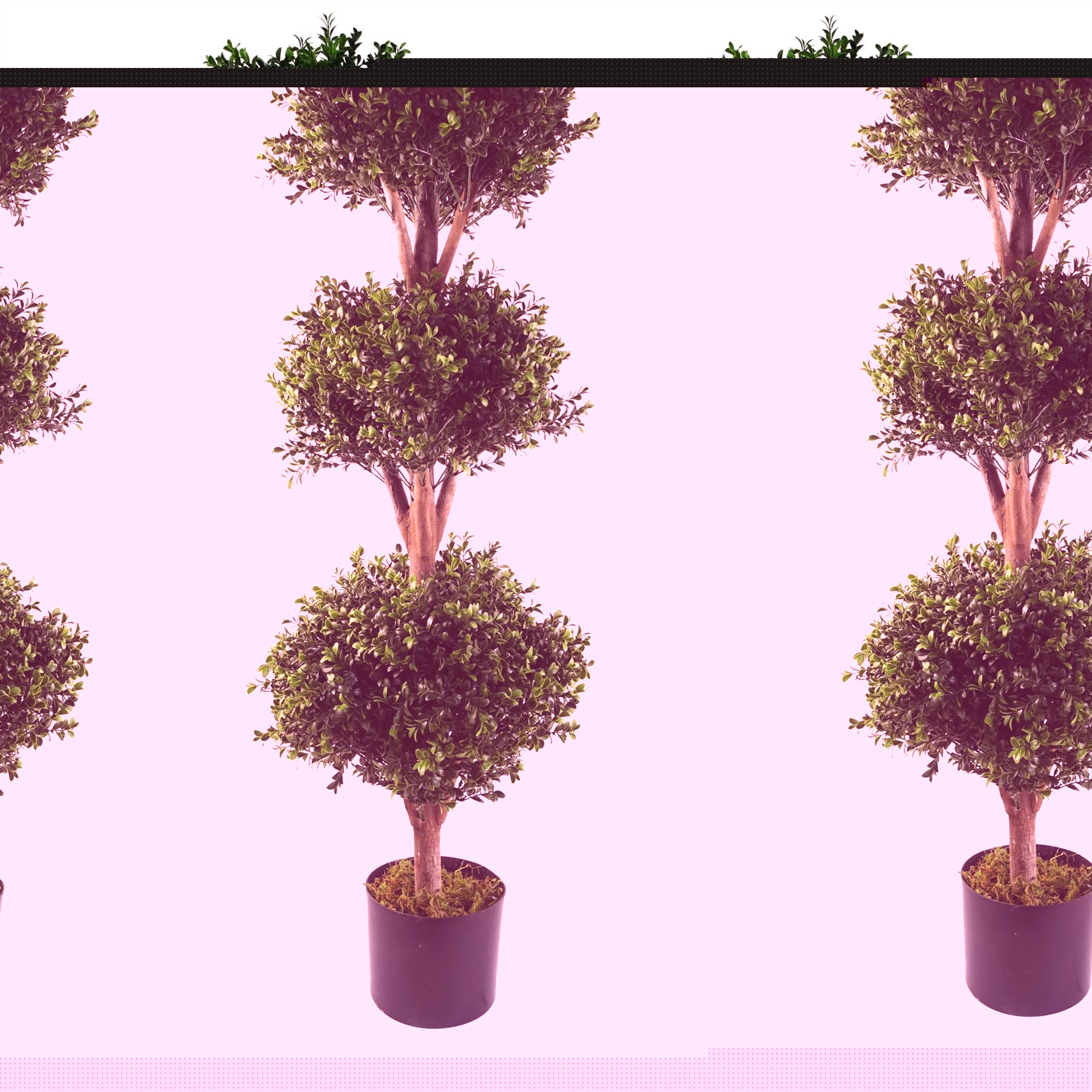 Price is for a Pair of these trees. A highly realistic replica of a triple ball boxwood buxus ball in a large size. This tree is UV resistant and designed to be used outdoors. As we have it arranged in our photos this measures 120cm high x 40cm x 40cm. Branches are wired and this can be shaped to fit your space. Plastic weighted pot measures: 18cm (d) x 14cm (h) approx. Potted in a plain plastic pot and is ready to display. You can make these trees look all the more impressive by popping inside a larger planter and covering with soil- bark or gravel to add to the realistic effect Genuine Leaf Design UK Product