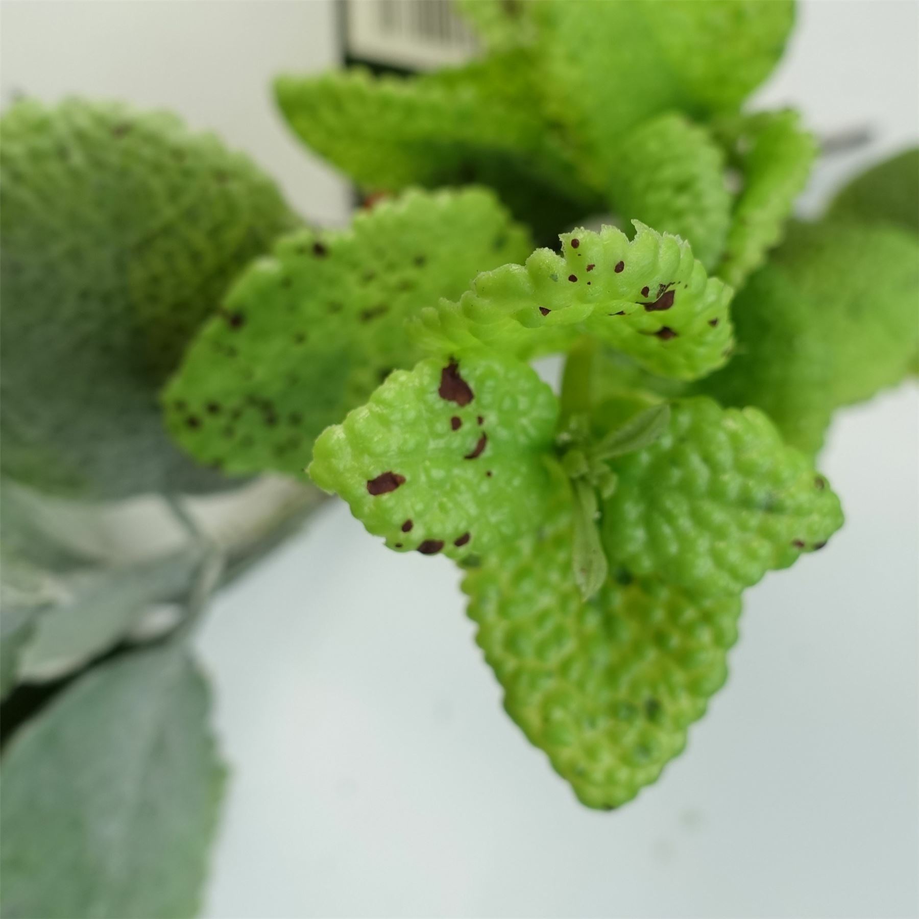 Genuine Leaf product. Artificial mint leaf garland. Foliage width as we have it arranged is 125cm x 30cm x 20cm approximately when totally outstretched from end to end. Leaves and stems are plastic. This is arrangeable and it is wired inside the stems so you can shape the garland to fit your space. This is a handmade item and there are minor differences between garlands. Part of our range of realistic plants and trees.