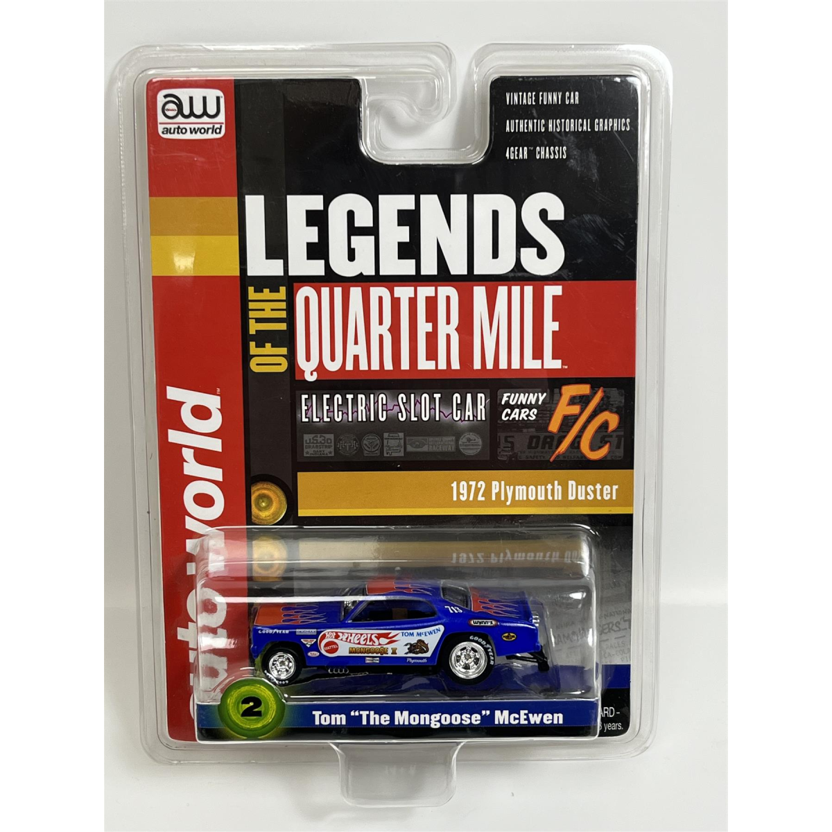 HO 1:64 scale Slot Car Comes in sealed blister pack Legends of the Quarter Mile 4-Gear Auto World Includes Neodymium Magnets Slot Cars are 100% Compatible with Tomy and AFX Sets