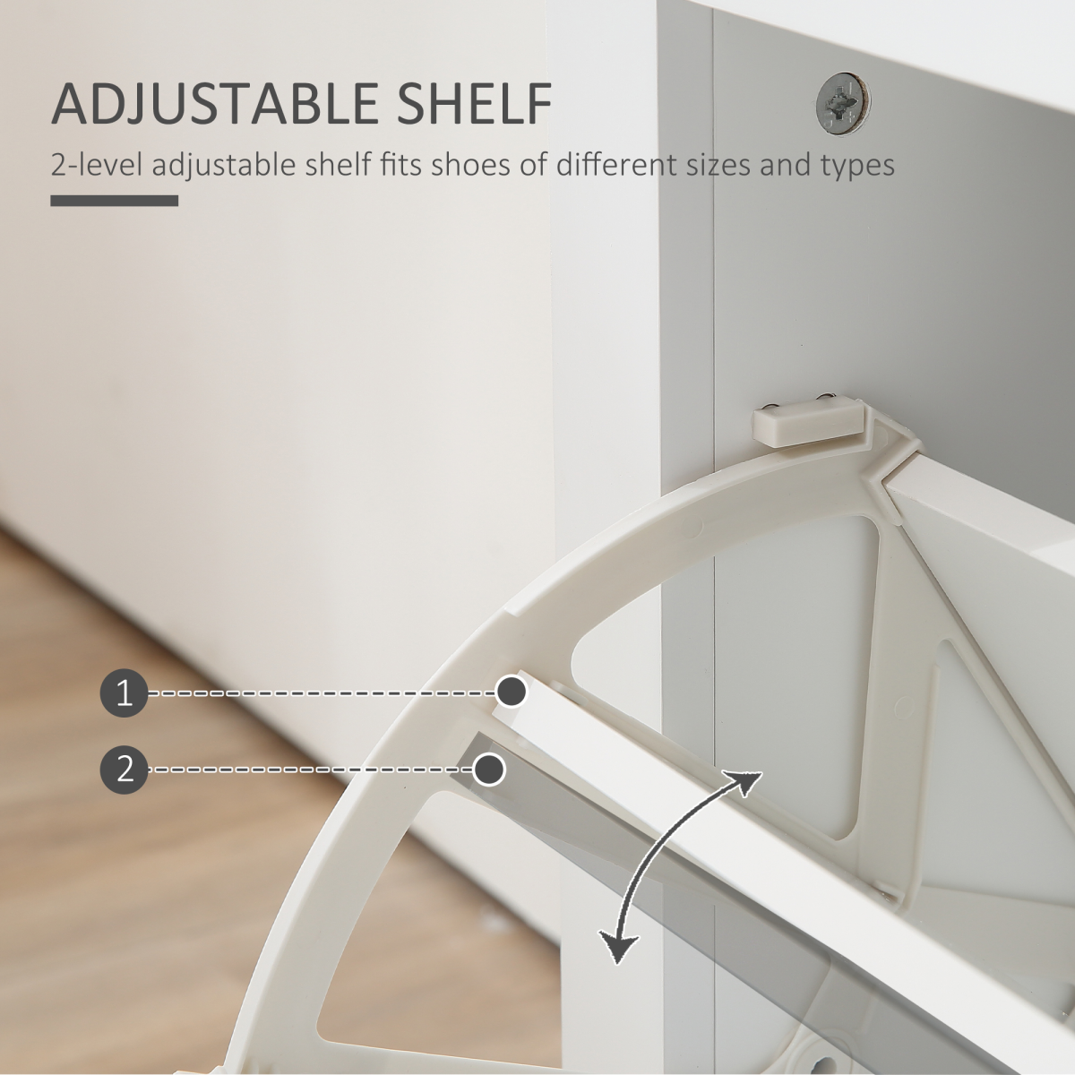 HOLDS 12 SHOE PAIRS: Two drawers, each can hold six - perfect for keeping your hallway/front entrance neat and tidy. Adjustable shelves in each drawer for flexible storage.FLAT TOP: Beautiful wood effect complements the modern white finish. Extra holding room - great for keys, decorations and more.STURDY: MDF structure is durable, suitable for everyday use. Foot pads to protect floor. Safe anti-tipping design so cabinet doesn't fall forwards.DIMENSIONS: 90.5H x 79L x 23Wcm. Compartment: 36H x 66W x 9.5Dcm. Compartment two: 36H x 66W x 8.5Dcm.MAXIMUM LOAD: Whole: 10kg. Drawer: 5kg. ASSEMBLY REQUIRED.