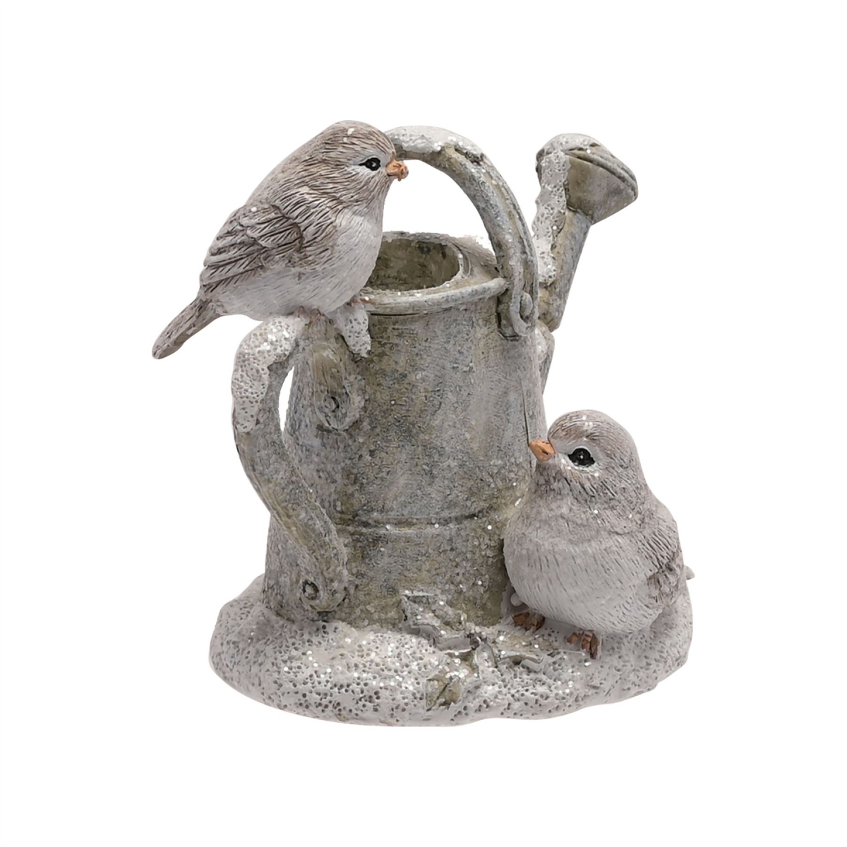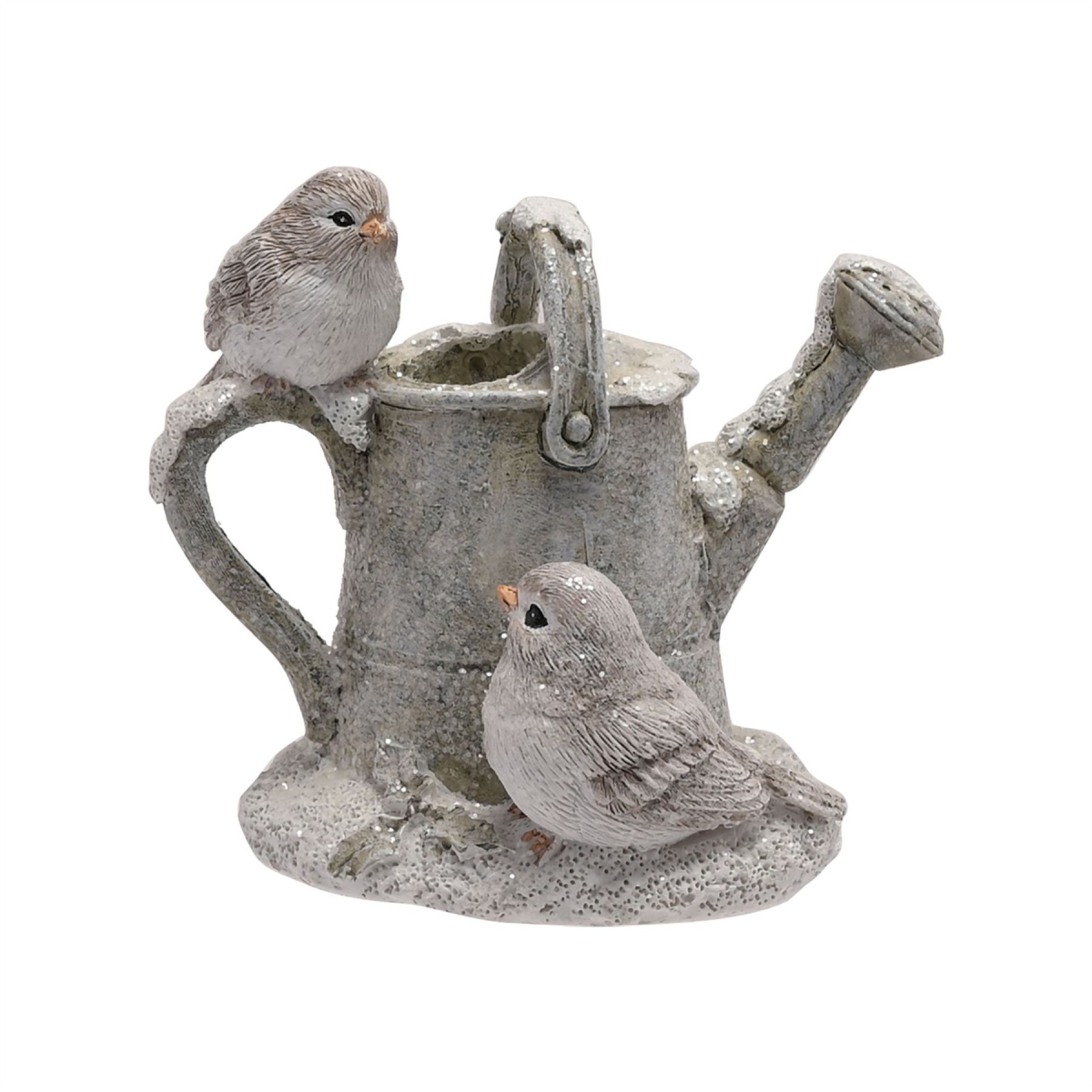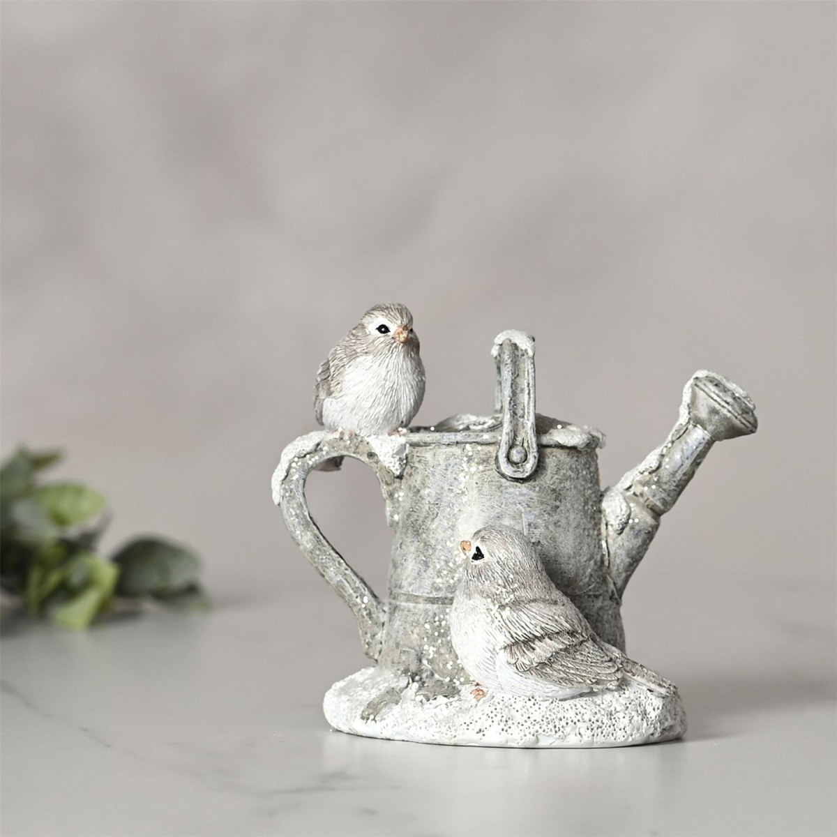 The white resin figurine showcases two robins perched upon a watering can. It is completed by a frosted finish with glitter touches.