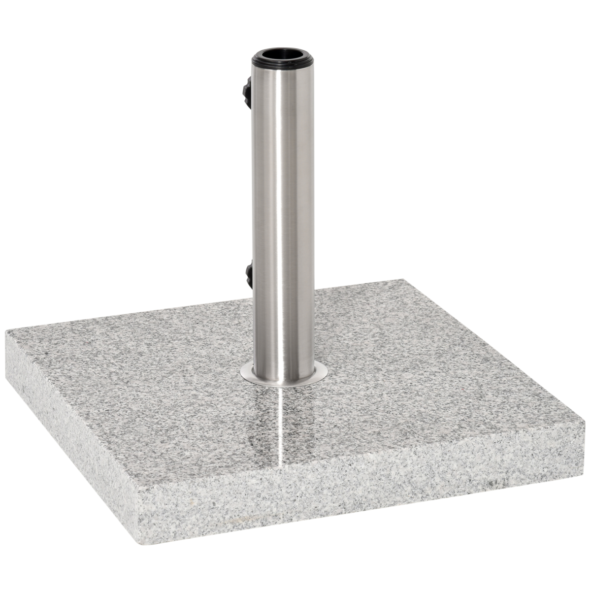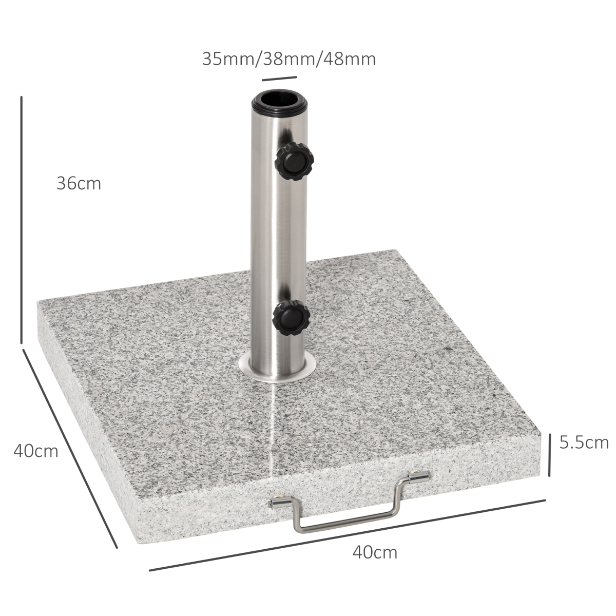 25 kg Marble Umbrella Base - Hemp Grey"Description: - This stylish base is a perfect accessory to have to complete your parasol. - The base is made from marble with a metal upright to hold the parasol.- It can accommodate most poles from ?3.4cm / ?3.8cm / ?4.8cm. - As the base is made of marble, it is heavy.- To make it easier to move around, there is a handle on one side and wheels on the other.- A great product to have in your garden or patio, this will complete your garden set.Features:- Made from marble and stainless steel- Perfect for outdoor garden, park, patio, deck, yard, poolside, and backyard- Suitable for ?3.4cm/?3.8cm/?4.8cm sized umbrella pole- With handle and 2 wheels for smooth movement - With 2 foot pads for preventing marble's direct touch with the ground- Rotary knob for fixing umbrella pole- Stand column with mirror surface processing made of stainless steel pipe- Marble base surface with polishing process- Space saving and portable