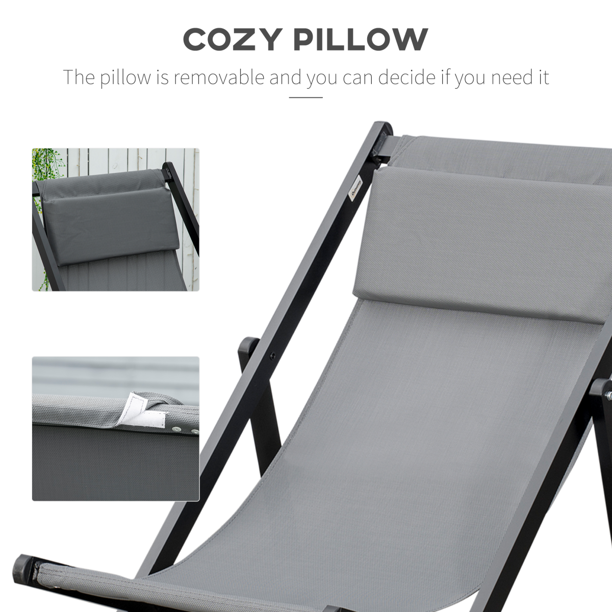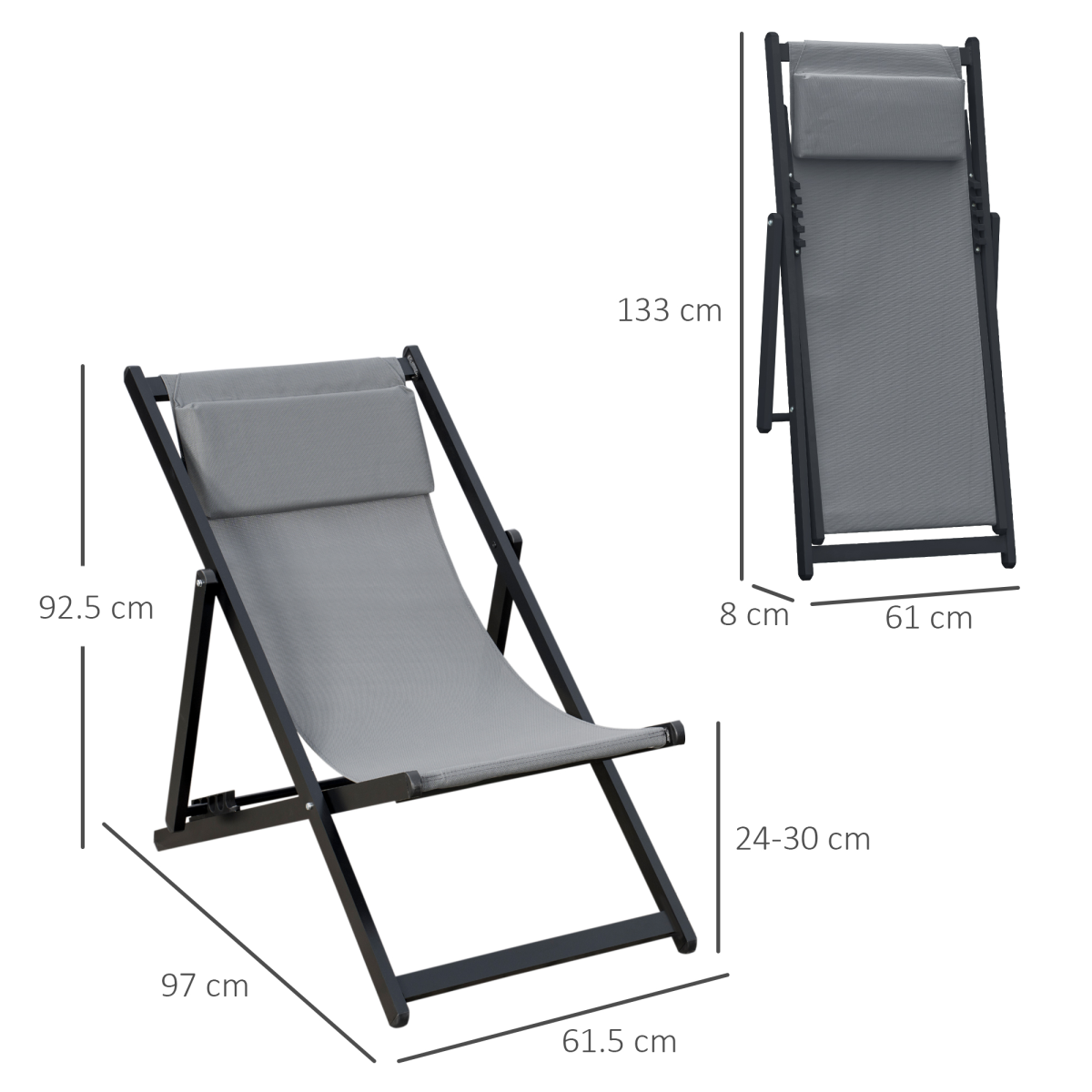Set of two: Folding sun lounger to relax with a friend in the sun - whether that be in the garden, park, on the balcony, the patio - wherever you chose!Folding aluminium frame: Strong and supportive core - each outdoor recliner chair will provide for plenty of use. Easy to carry and store.Five-level adjustable back: Can be set to a position you find best - relax in the garden sun lounger the way you choose.Fabric seat: Relax in comfort on the garden recliner, with a pillow included for the head and neck.Dimensions: 91.5H x 58W x 96.5D cm. Folded: 5H x 126L x 58Wcm. Seat: 24-30H x 46Wcm. Maximum load 160kg.