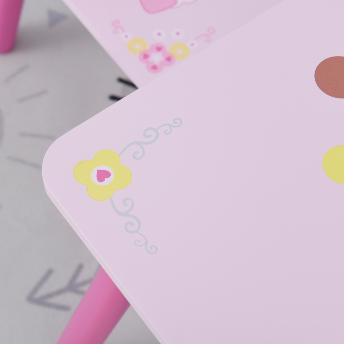 THREE-PIECE SET: Includes a table and two matching chairs. Great for when your child's friend comes over to play.SAFE AND SOLID: Crafted from a blend of MDF and pine wood, each piece is tough and durable for reliability. Rounded edges ensure safety with children. Smooth surface can be wiped clean easily.CUTE PRINCESS DESIGN: Pink in colour, it features a crown and dress print on the seats and table top. Crown-shaped chair backs with a 'princess'print for extra fun.ANGLED LEGS: Helps keep the table and chairs as balanced and stable as they can be. DIMENSIONS: 42H x 55L x 34Wcm. Chair: 50H x 28L x 26Wcm.MAXIMUM LOAD TABLE 30KG. MAXIMUM LOAD of ONE CHAIR 25KG. EASY TO ASSEMBLE.