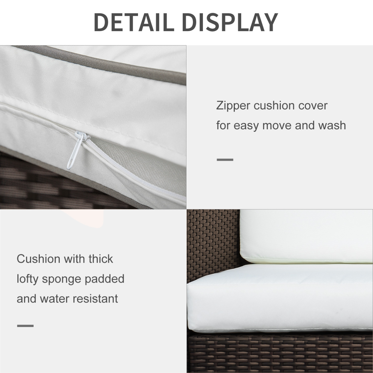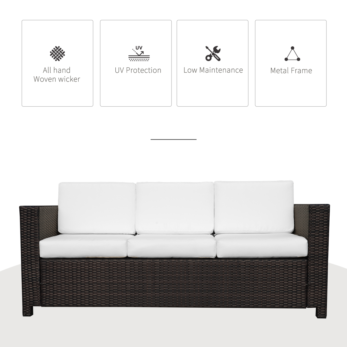 Three-seater size, ideal for placing in your garden, patio and outdoor etc. Powder coated, galvanised metal frame, ensures strength and provides a solid foundation whilst you sit Wicker-rattan in a stylish brown is resistant to UV fading and mild weather-damage to prolong its lifespan Thick seat and back cushions allow you to sit in comfort, with washable and water-resistant cushions Cushions need to be removed from seats during heavy rain and weather Four feet to protect bottom from damage and keep sofa balanced and stable Matching skus: 860-031GY (two-seater sofa) and 841-008V70 (single armchair) Maximum weight 180kg, assembly required
