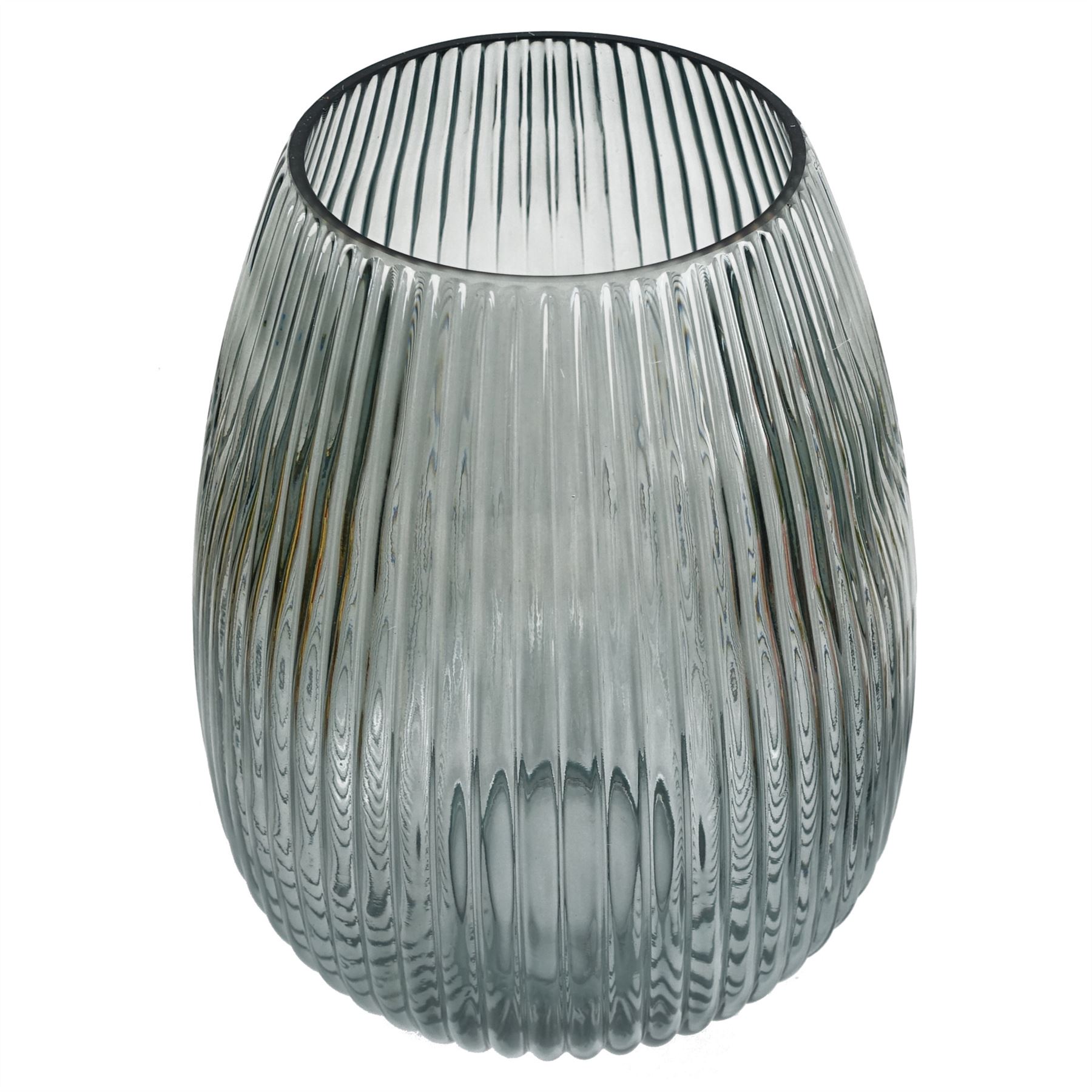 Grey smoke glass vase ridges patterns. 30cm x 20cm x 20cm at widest points. The top rim measures 12cm. This is suitable for both real and artificial flowers. These glass vases are hand finished and there may be small differences between them. We have also included some pictures along with some of our artificial flowers to give an idea of size and usage but no flowers are included with this vase.