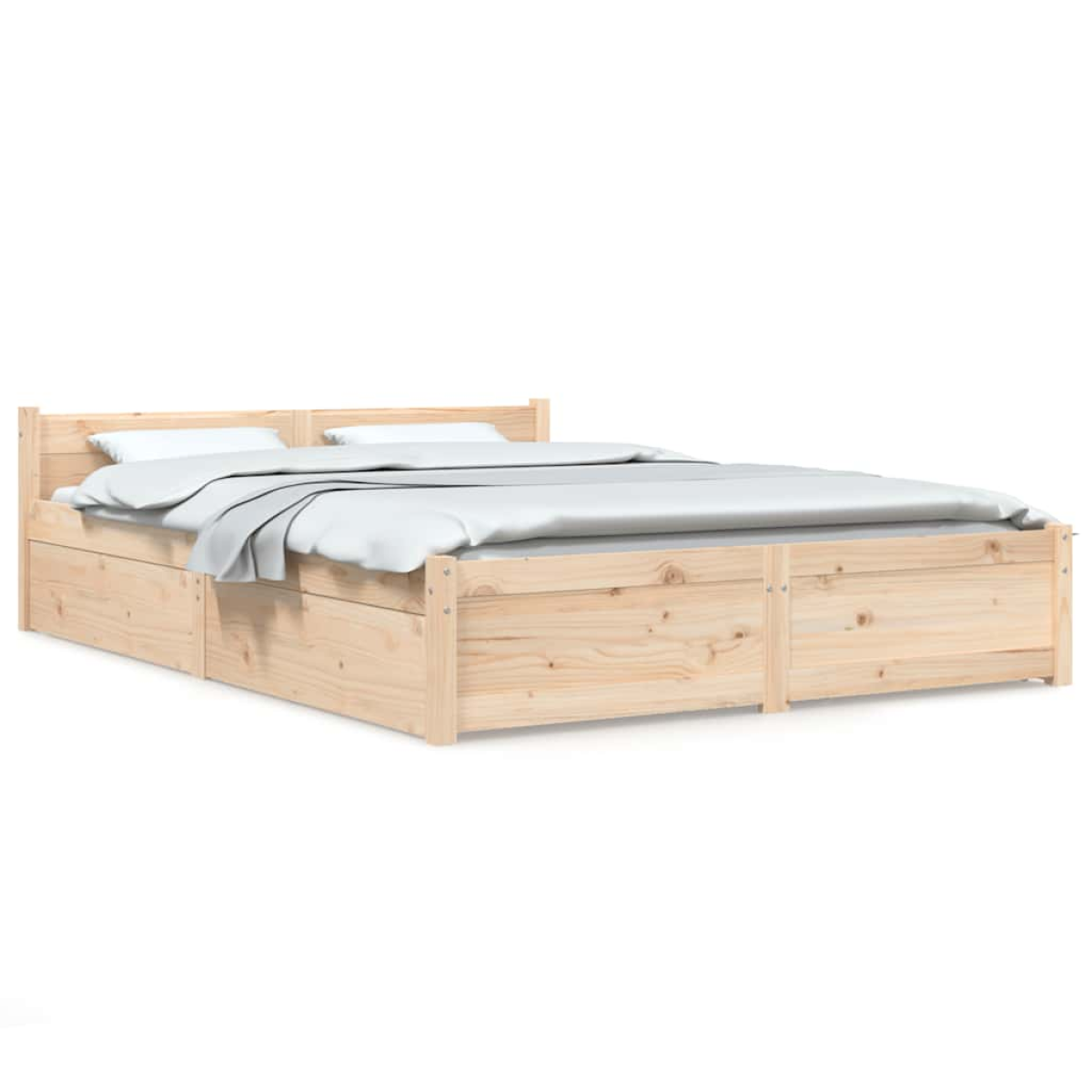 Add a modern touch to your bedroom with this classic wooden bed frame! It makes a practical and decorative addition to your interior. Solid pine wood: Solid pine wood is a beautiful natural material. Pine wood has a straight grain, and the knots give the material its signature, rustic look.Sturdy slats: The plywood slats provide good weight distribution, ensuring that the mattress stays in place with every twist and turn of your body during sleep.Storage function: The included bed drawers provide ample storage space for storing your essentials, keeping your room clean and tidy.Comfortable headboard: The classic headboard lets you rest comfortably while reading or watching a movie. Note:The delivery includes a bed frame only. The mattress is not included. You can check our shop for the matching mattresses.This bed frame is suitable for a mattress measuring 140 x 200 cm.