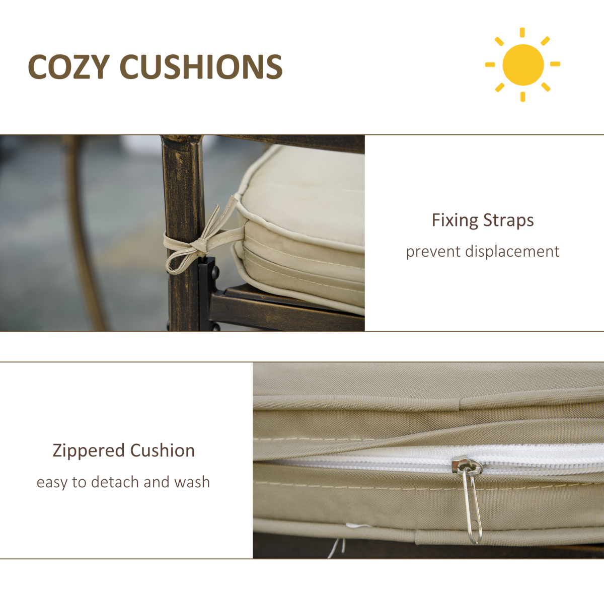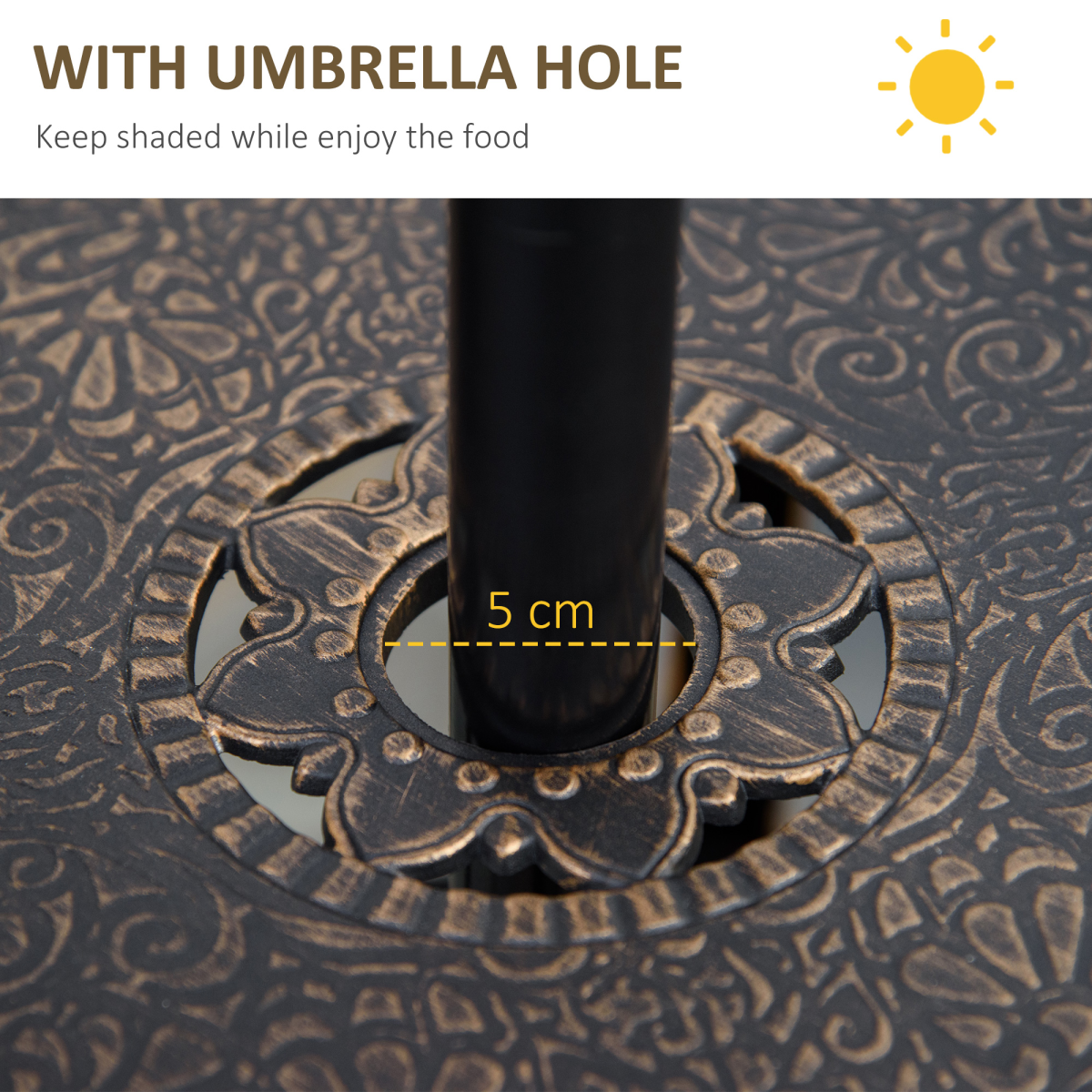 With our Outsunny 4 seater garden table set with cushions, you can quickly create a great outdoor space to spend leisure time with your friends and family. The antique design with bronze finish gives your patio a sense of regalness, lending an air of luxury to the whole space. The table has a hole in the middle, allowing you to place a nice umbrella for dining in the shade. Check out this durable and luxurious cast aluminum outdoor dining set, and start enjoying your time outside.