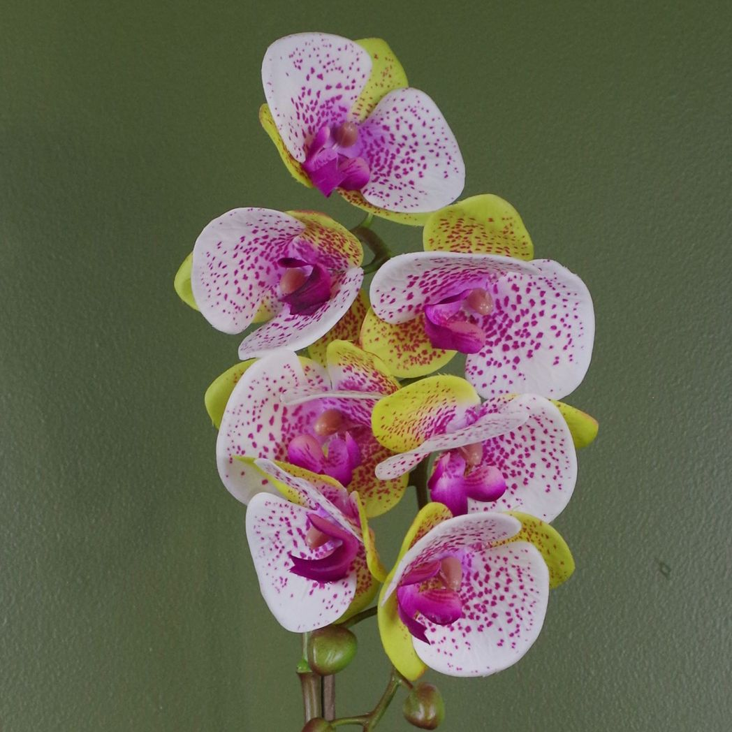 Part of our range of realistic artificial orchids, this plant is potted in a plastic decorative pot with fixed gravel topping. Realistic artificial orchid plant with real touch leaves, glued fixed gravel base, potted in a plastic decorative pot as shown. 7 real touch flowers. Pot is plastic and measures 9cm (h) x 10cm (w) Overall height as arranged in our photos 46cm. Stems are wired and this plant can be arranged to your requirements.
