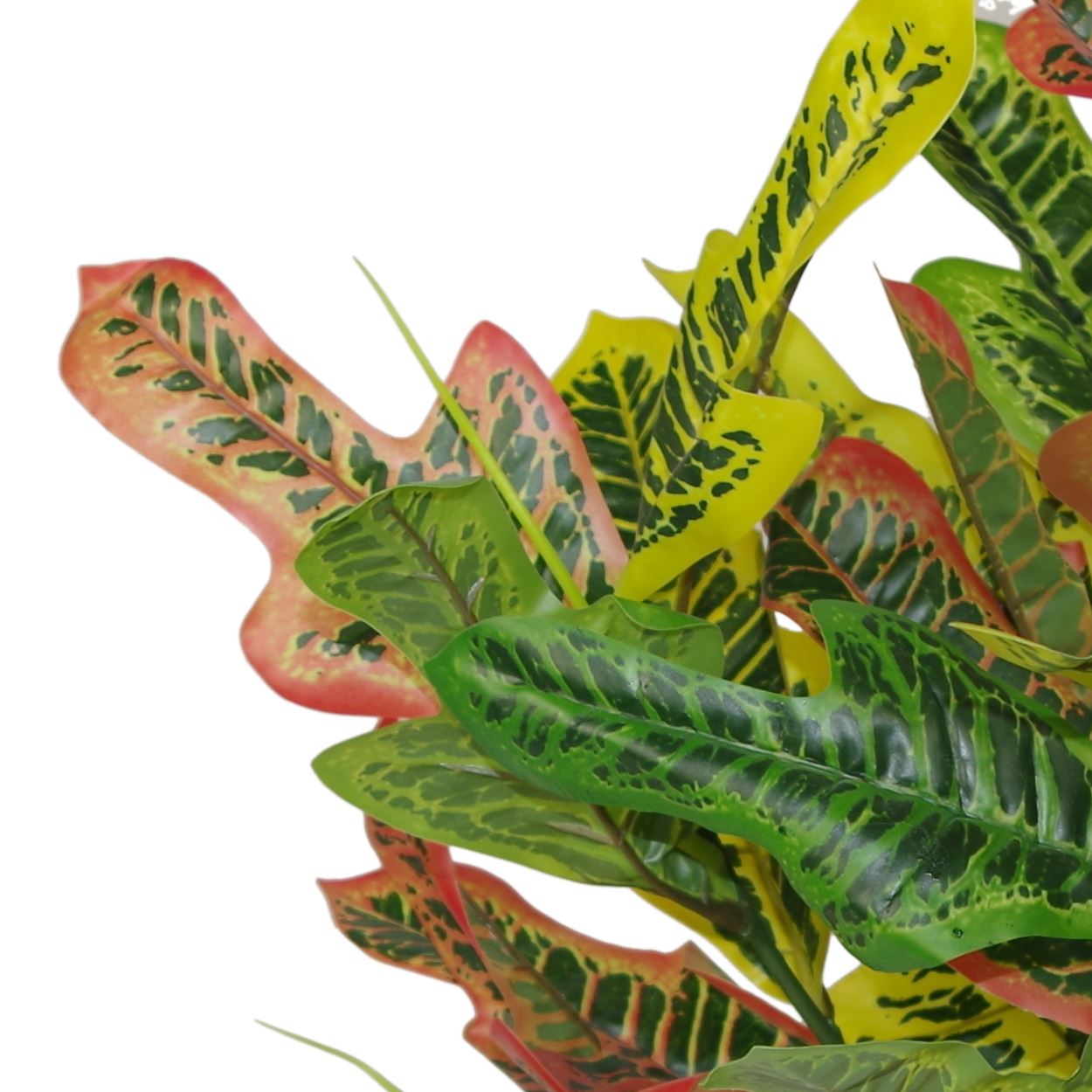 Codiaeum Variegatum (also known as Variegated Croton- Garden Croton and Joseph's Coat) is a plant native to Australia and Indonesia. With its beautiful variegated leaves it is easy to see why this is a popular houseplant. Real Codiaeum Variegatum plants are not only poisonous but are also extremely tricky to grow and maintain indoors making an artificial Codiaeum Variegatum plant the ideal alternative! This artificial plant stands 65cm high when arranged as shown in the pictures. The width will vary depending on how you arrange the leaves. We also supply this same plant in both a larger and smaller size if this isn't quite what you are looking for. Our artificial version is extremely realistic and totally safe (real Codiaeum is both poisonous and irritant!) The stems are wired and can be rearranged to suit your requirements. It comes potted in a plastic pot and is ready to display - just arrange the stems as you wish.