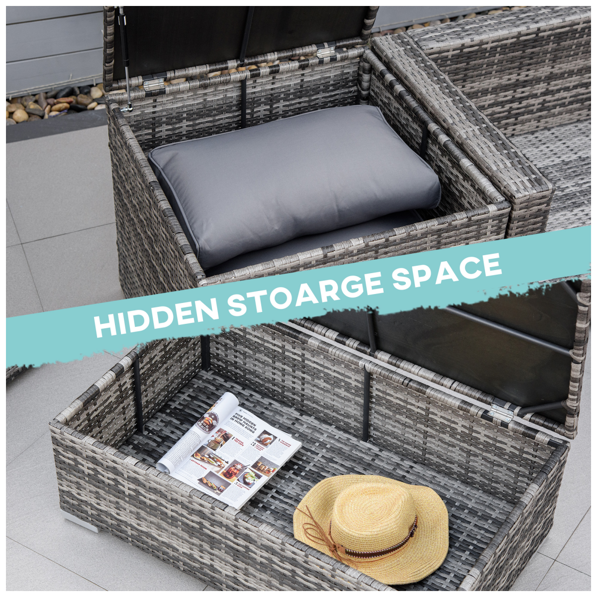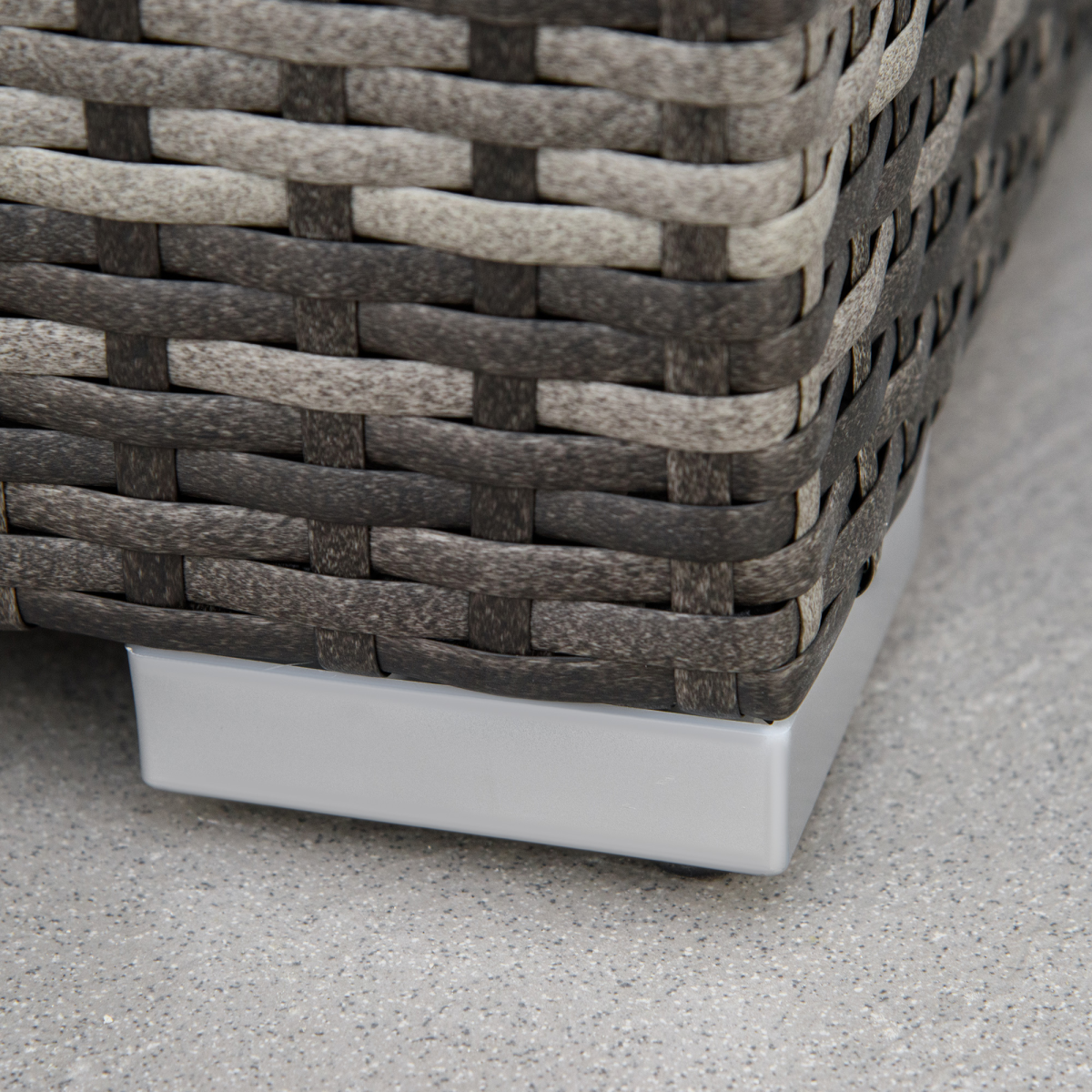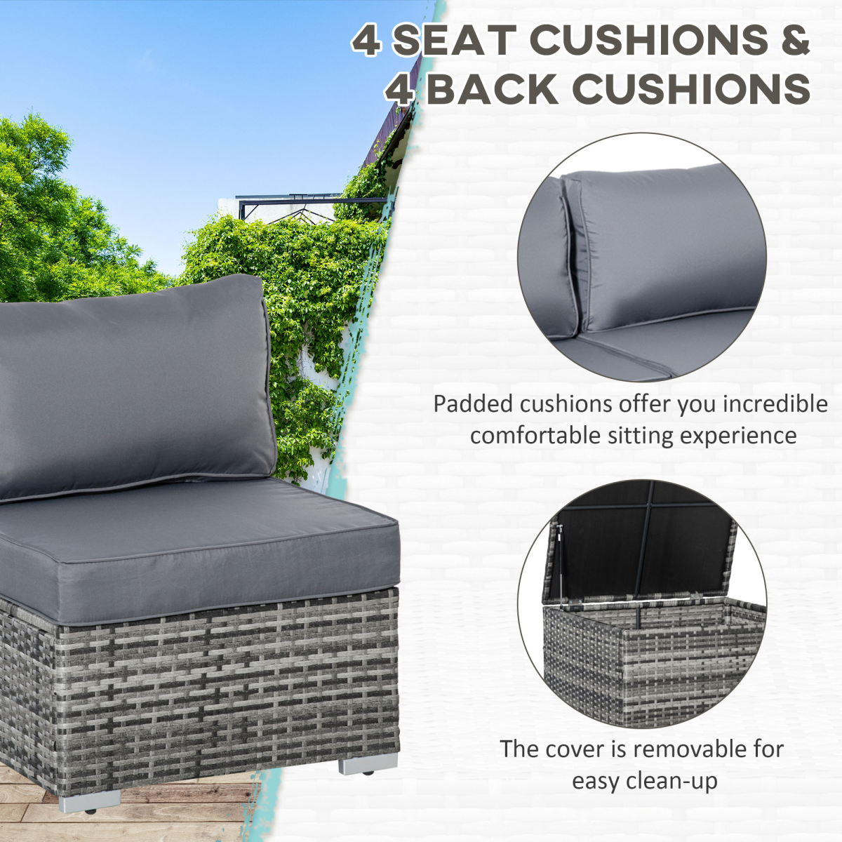 Steel frame, wrapped with plastic rattan Storage in side table and coffee table Thick padded cushions for comfort, covers are washable Suitable for conservatories, patio and outdoors Assembly required