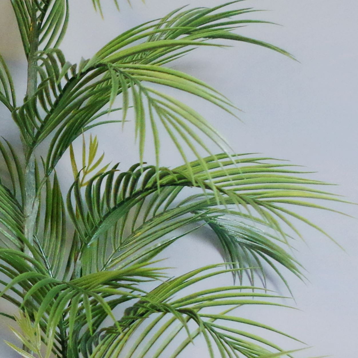 90cm artificial palm tree potted in decorative planter. A gorgeous artificial palm in a decorative plastic planter- ready to display staight out of the box. 14 large leaves and four small leaves. The stems are wired and the leaves can be shaped to fit your space. As we have the palm arranged in our photos it measures 90cm x 70cm x 50cm. The decorative grey plastic planter measures 15cm (h) x 15cm (w). The leaves are plastic. The decorative planter is topped with fixed pebbles for an attractive- low maintenance finish.