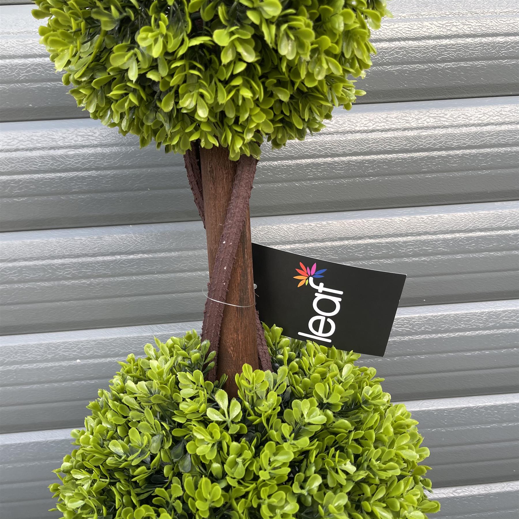 Pair of artificial boxwood double ball topiary trees suitable for outdoor use. A realistic imitation of a topiary tree which stands 90cm high and 25cm wide at extents. It comes potted in a weighted black plastic pot. We recommend putting this inside a larger planter for a more impressive effect. The trunk of this tree is real wood so there will be some variations from tree to tree - each one is slightly unique. Available in a variety of sizes.