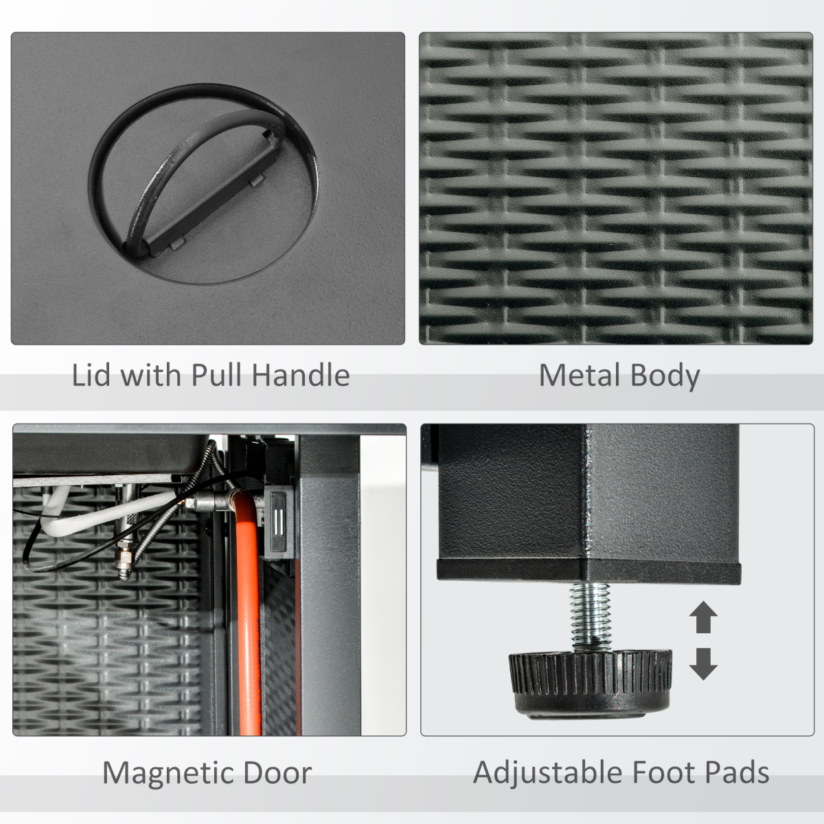 40000 BTU stainless steel burner for plenty of heat Lid conceals the firepit when not being used, transforms it into table Pulse ignition system to light up easily and adjust flame Lava rocks retains warmth longer Practical door to conceal and allow easy access to the propane tank Rain cover provide protection when not in use Assembly required