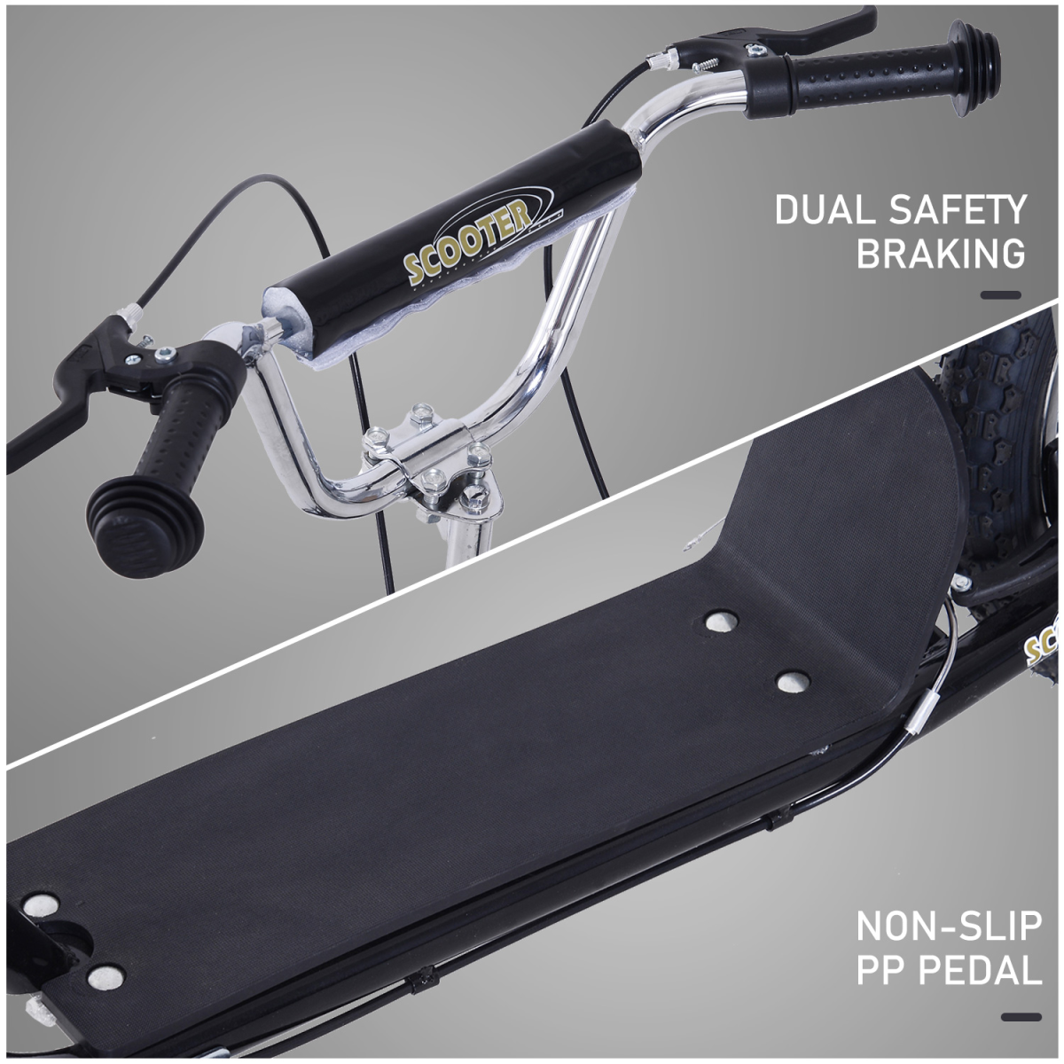 SAFE TO USE: A scooter with big wheels, keeping the ride smooth C can be used as an offroad scooter. Brakes at the front and rear for a swift stop. Wide non-slip deck for balance when riding.