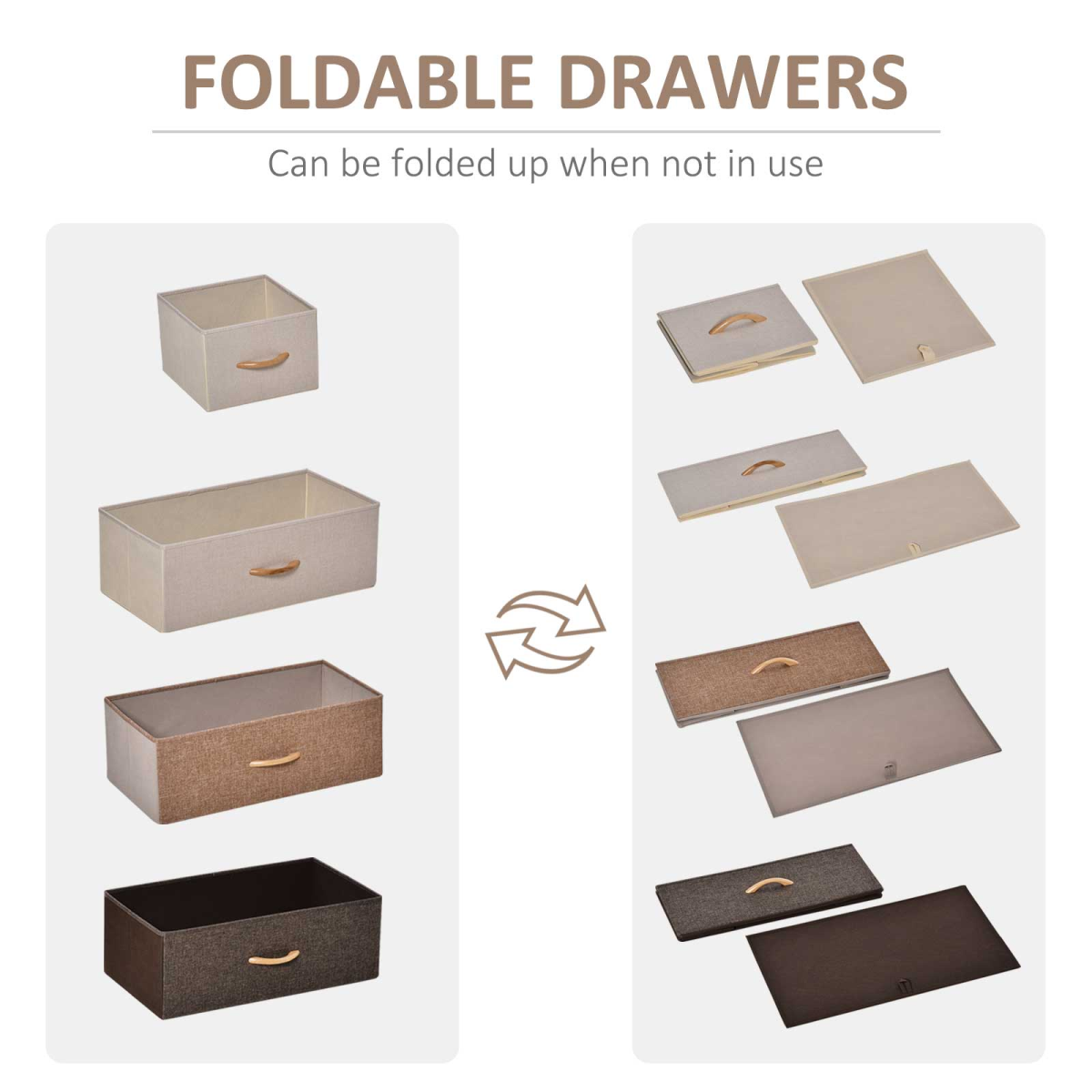 LARGE CAPACITY STORAGE: The linen dresser tower with 5 separate drawers allows you to store dozens of pairs of socks in one drawer. The storage drawers can keep household items in order, including clothes, toys, cosmetics, daily necessities and towelsFOLDABLE DRAWERS: This drawer unit features 5 foldable drawers. Drawers are made of breathable lien fabric which is easy to clean. Handles make opening and closing simple. The fabric drawers can be folded when not in use. You can place the dresser in the closet, bedroom or cornerSOLID CONSTRUCTION: Strong steel frame and durable MDF top with smooth finish offering reliable stability to the bedroom drawers. Adjustable feet for uneven ground, increase stability and protect the floor from scratchesANTI-TOPPLING DESIGN: Anti-toppling device at the back of the tallboy chest of drawers, which can be fixed to the wall to protect you and your family. Elevated design can effectively protect your clothing or other items from getting wetDIMENSIONS: Overall Dimension: 58W x 29D x 99H cm, Drawer Inner Size: 27.2W x 26.2D x 18.5H cm (small), 53.2W x 27.2D x 18.5H cm (large). Weight Capacity: 34kg (overall), 5kg (large drawer), 2kg (small drawer), 15kg (shelf)