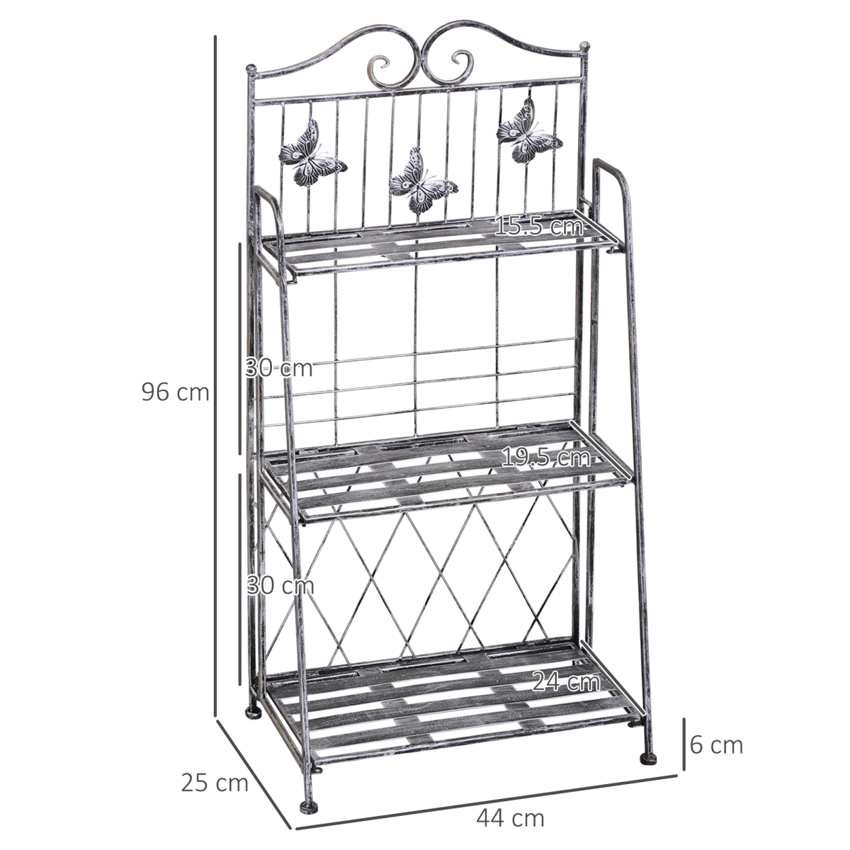 METAL PLANT STAND: This charming 3-Tier flower stand adopts durable metal construction for high stability, a great addition to your front porch, back patio, or indoor living space. VERSATILE USE: This metal plant stand can double as a chic cookbook shelf, shoe rack, garden tool storage rack and more. FOLDING DESIGN: This perfect-sized plant shelf can easily fold when not in use for convenient storage. You can clean the stand shelf easily with a damp cloth. LOAD BEARING: This outdoor plant stand is strong enough to withstand strong winds and heavy rain, the maximum weight is 66lbs (22lbs for each tier). DIMENSION: Overall Dimension: 44Lx25Wx96H cm, Tier Spacing: 30cm, easy assembly is required.
