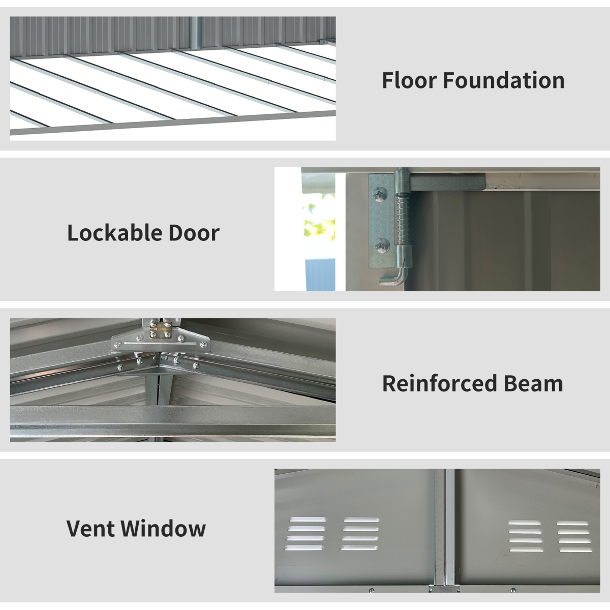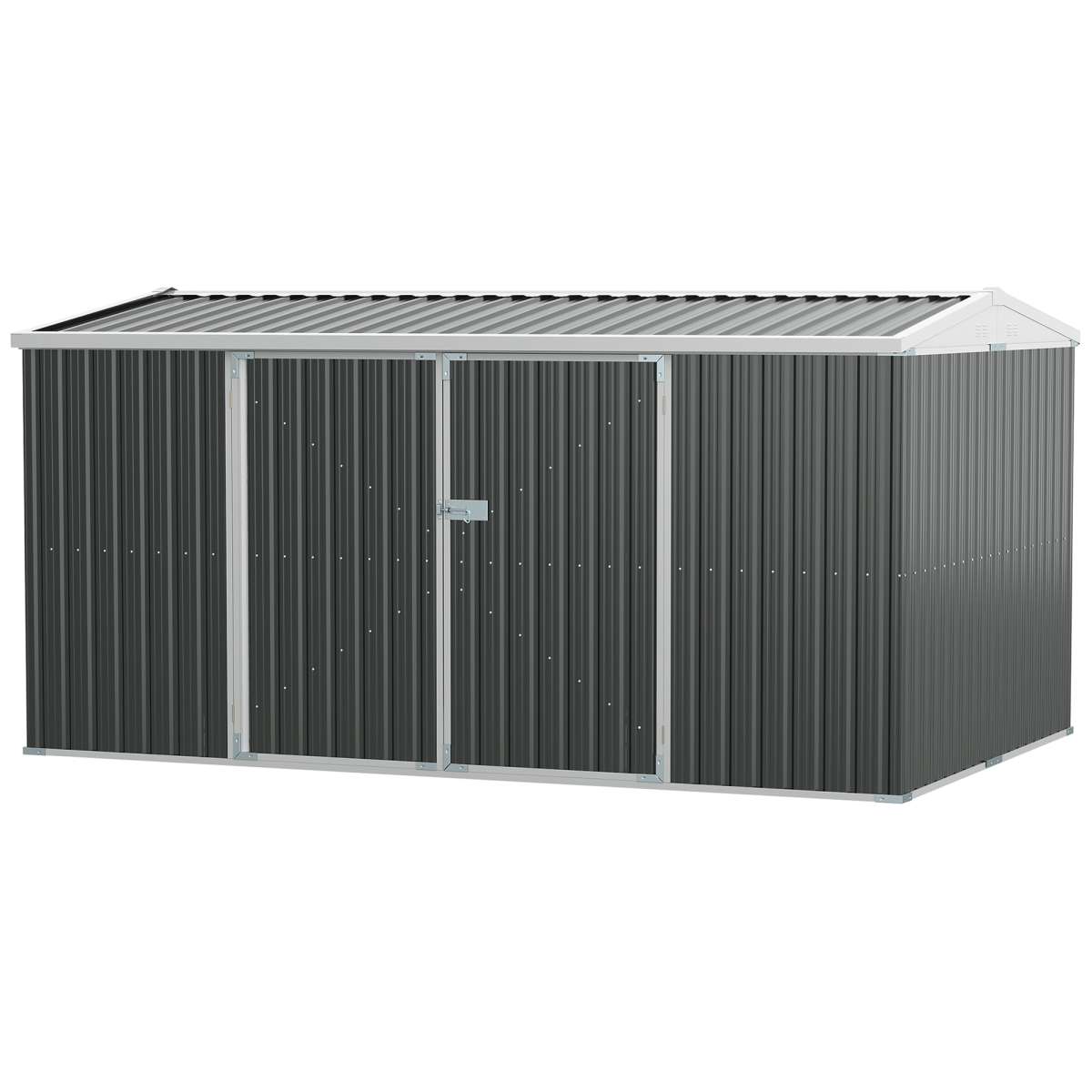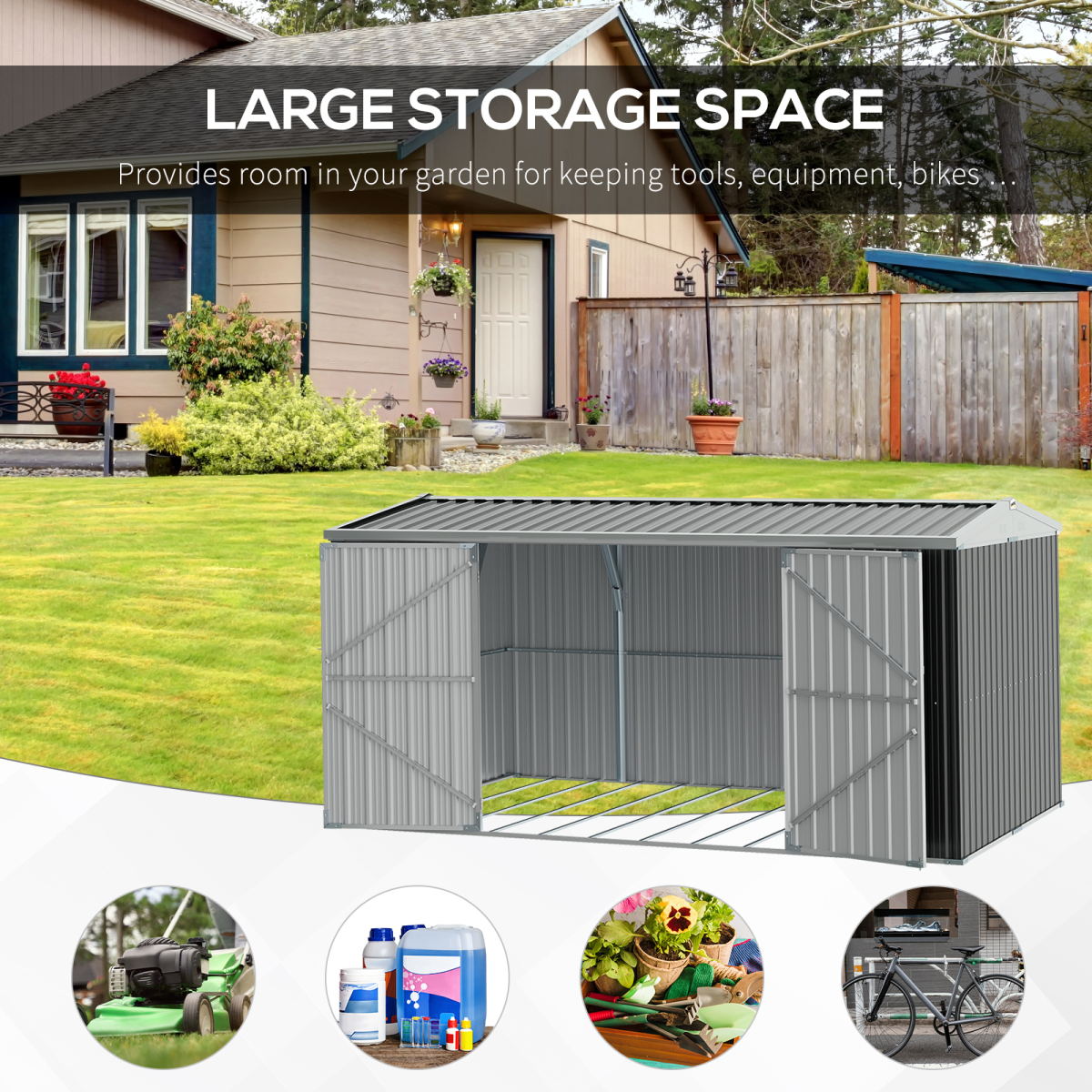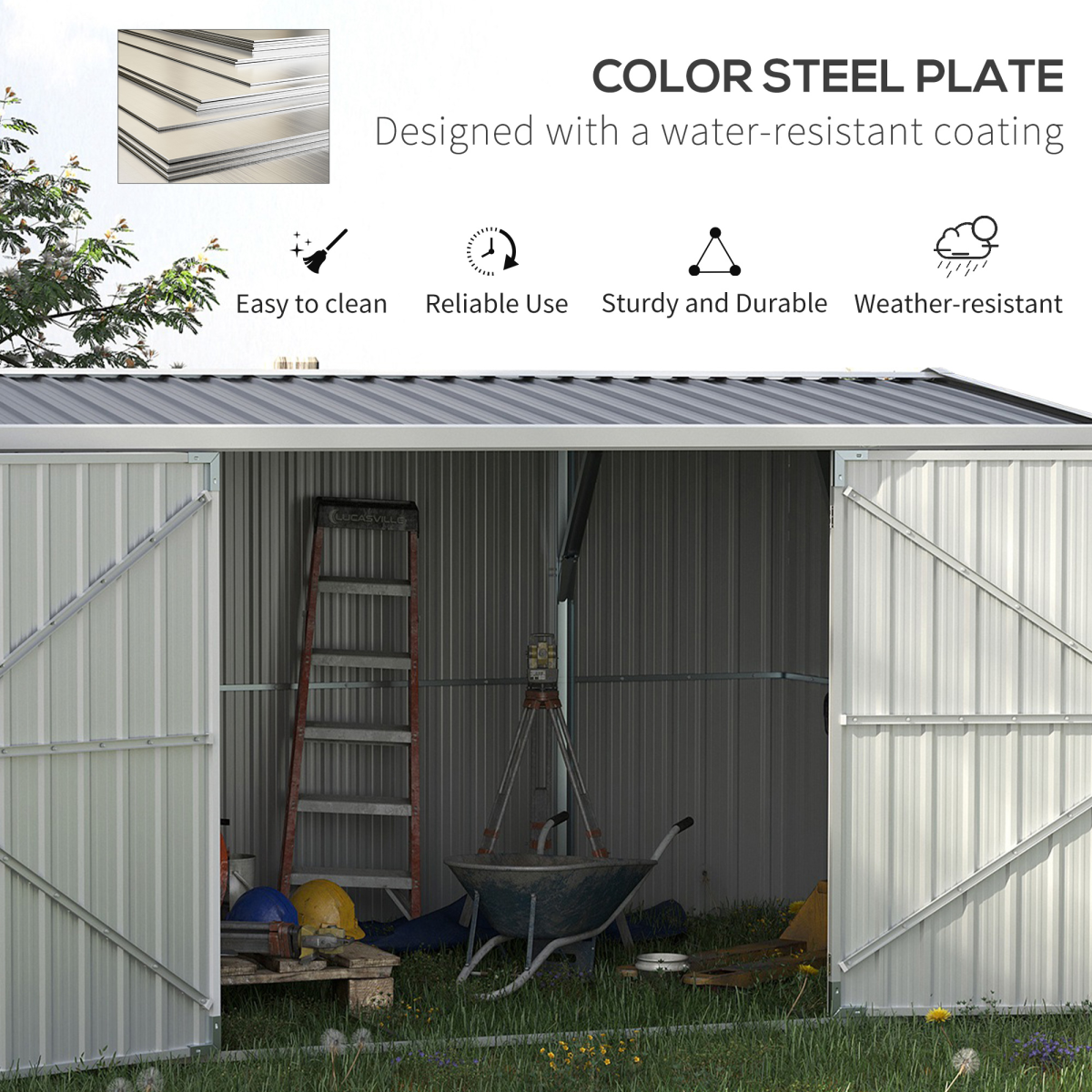 LARGE STORAGE: Provides spacious room in your garden for keeping tools, equipment, bikes, bins and anything you need to be kept dry and protected.STEEL FRAME: The tool storage is constructed from durable galvanized steel with a water-resistant finish. The sturdy tool shed is moisture-proof and anti-corrosion, which is ideal for long-lasting outdoor use.SLOPED ROOF: Designed with a sloped roof, this backyard shed allows rainwater to drain quickly, avoiding accumulation of water on the roof. Besides, four windows on sides of the roof to keep air circulation.LOCKABLE DOOR: Features double pull-out door, this outdoor storage box ensures easy access. And latch on door ensure more security for your items.DIMENSIONS: Overall Dimensions 420L x 245W x 200Hcm, Bottom Size: 420L x 230Wcm(9.7m²), Inner Size: 416L x 228W, Door Size: 78W x 175Hcm(Single). Assembly required.