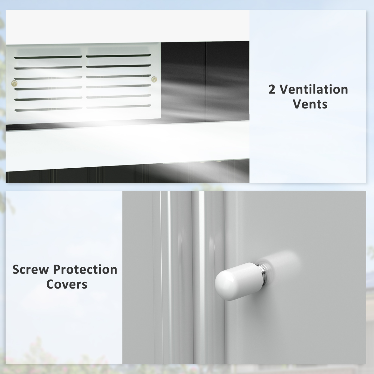 SPACIOUS STORAGE SPACE: Garden metal sheds provide enough room in your garden for your gardening equipment, tools and outdoor equipment. GALVANISED STEEL: Finished with a top coat for weather protection, this small shed is strong and durable for long lasting use in your garden. DOUBLE SLIDING DOORS: Allows easy access in and out this metal bike shed and save storage space. Our metal garden sheds with base provides safe area to keep your equipments. VENTILATION WINDOWS: 2 ventilation slots on the front of this garden tool shed, allows air to sufficiently circulate around inside, preventing any moisture and mildew build up.