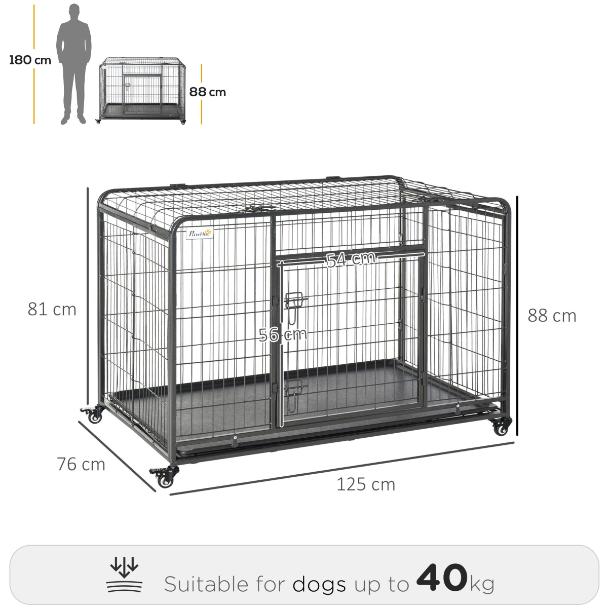 FOUR WHEELS: This dog crate moves around smoothly, even when inside is full. Brakes on all wheels so it stands in place.LARGE AND SAFE DOOR: Easy to enter and leave, with two locks for safety. Top panel can be removed to access inside from the top.METAL STRUCTURE: Keeps your dog safely inside, with the wire design meaning they can breathe fresh air.FOLDABLE: Compact size to store easily. Removable plastic tray for cleaning. Overall Dimension(without wheels): 125L x 76W x 81H cm. Overall Dimension(with wheels): 125L x 76W x 88H cm. Door: 56H x 54Wcm.MAXIMUM LOAD 80KG. FOR X-LARGE DOGS WITHIN 40KG, LESS THAN 100CM/70CM IN BODY LENGTH/SHOULDER HEIGHT. EASY TO ASSEMBLE.