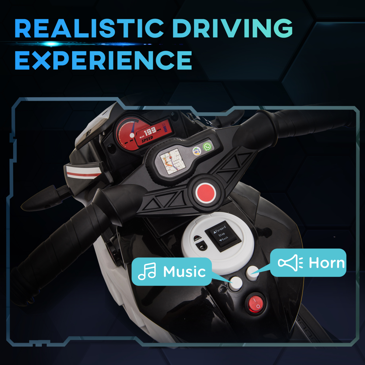 RECHARGABLE: Comes with a battery, with one full 8-12 hour charge providing up to 45 minutes of play.SAFE: Large moulded seat for them to sit, three large wheels to keep the balance and two handlebars for them to hold on whilst moving. Reaches a maximum 3km/h so they don't drive too fast.REALISTIC FEATURES: Plays music, has a horn and working headlights - making it extra fun whilst on the go. Drives forwards and backwards.DIMENSIONS: 52H x 86L x 42Wcm. Wheel: ?23 x 7.5Wcm,MAXIMUM LOAD 25KG. FOR AGES 37-60 MONTHS.