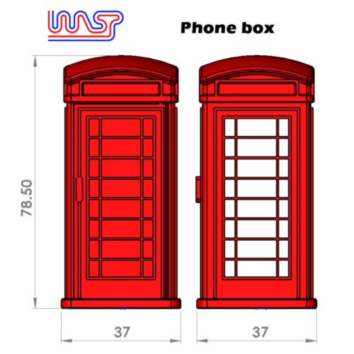 3D printed in the base colour shown. supplied as a kit for self assembly. See instruction image for details Width x Height x Depth size - 38.5mm x 78.5mm x 38.5mm Phone boxes were designed and manufactured are 3D printed and therefore will not be perfect (the pictures are of actual printed parts and layer lines can be seen) Colours may vary slightly between plastic batches. Only phone box is included figures and other accessories in the picture are for illustration only Safety - Please note these phone boxes are intended for decoration purposes only, they are not a toy and should not be used by children under 12 years. They could be a choking hazard if swallowed