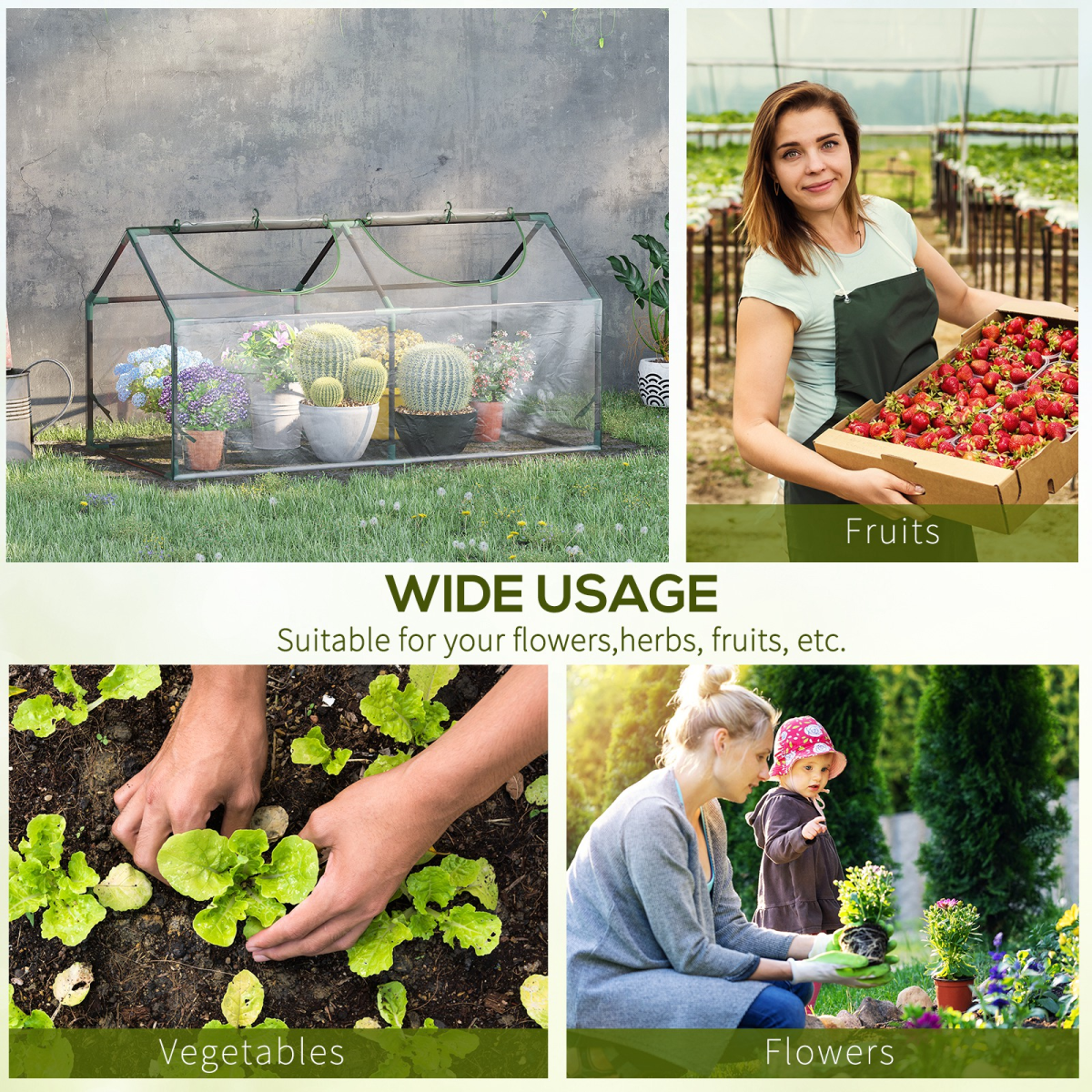 Mini size: Easy to grow plants, vegetables, herbs and flowers almost anywhere. Great for smaller flats and houses, with limited space, like balconies.Two roll-up windows: Easy to open and fix back, to allow air inside when needed. Also, easy to water plants, too. Keeps them healthy and helps them grow.PVC plastic cover Water and UV resistant, protects plants from weather, whilst allowing sunlight inside, giving them lots of natural nutrients. 10cm extended edges to bury into the soil.Steel frame: A strong core, keeps the greenhouse standing upright and in shape.Dimensions: 60H x 120L x 60Wcm. Do not leave in heavy weather conditions. Assembly required.
