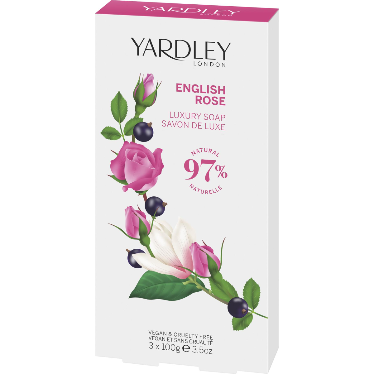 This Soap is infused with Yardley London's English Rose fragrance a refreshing, light fresh floral with sparkling citrus and rose top notes blended with tea accord. Combining a complex floral heart of rose bud, magnolia, violet and cassis with warm woody notes, its enhanced with patchouli and musks, adding velvety tones to the base. Containing revitalising rose water and moisturising sustainable shea butter, it is finely milled for a luxurious lather that leaves your skin feeling clean, soft, smooth and delicately fragranced.