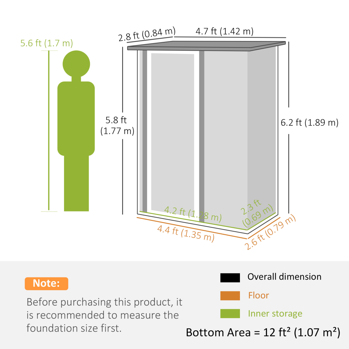 Open inner storage: Small shed provides plenty of room in your garden for keeping tools, equipment, bikes and anything you need to be kept dry and protected. Floor foundation NOT included.Steel frame: Galvanised shed for extra strength, provides a stable structure, with a weather-resistant top coating for reliability outdoors.Sloped roof: Prevents any liquids building up and stagnating to rot or rust the pent shed.Hinged door: Allows easy access in and out this lean to shed, with a latch fastening to keep it shut.Dimensions: 189H x 142L x 84Wcm. Inner: 186H x 128L x 69Wcm(1.07?). Door: 171H x 63Wcm. Gloves MUST be warm when assembling to avoid potential injury.