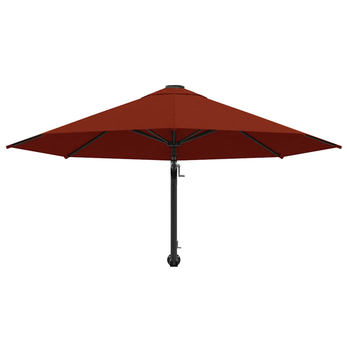 This elegant wall-mounted garden parasol is perfect to create some shade and protect you from the sun's harmful UV rays. Made of UV protective and anti-fade polyester, the parasol cover provides you with optimum protection against the sun and is easy to clean. The exclusive design of this parasol allows you to tilt the parasol to block the sun as it heads down towards the horizon. The strong metal pole, along with the 8 durable ribs, makes the parasol very stable and durable. The garden parasol can be easily opened and closed thanks to the crank mechanism. The item is easy to assemble. Delivery also includes the mounting accessories. Please note that we recommend treating the parasol fabric with a waterproofing spray if it is subjected to heavy rainfall. The height of this wall-mounted parasol depends on the height it is mounted on the wall