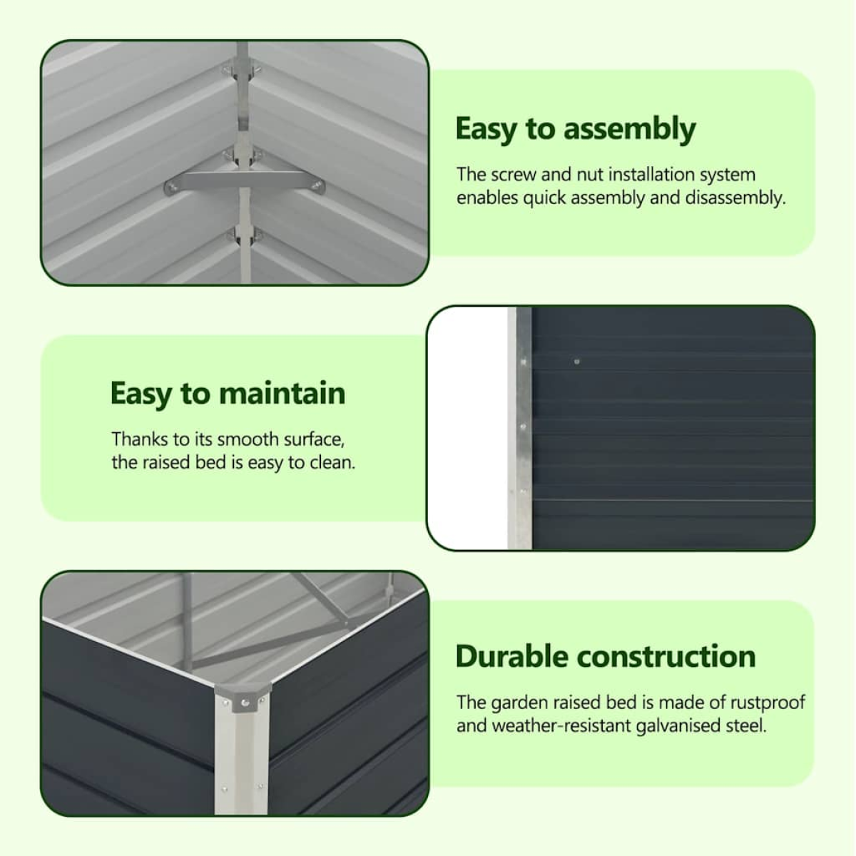 This raised garden bed is extremely durable and beautifully made. It is deep and wide enough to hold a large amount of soil and provide ample space for your plants, vegetables, herbs and flowers. Thanks to its simple rectangular design, it will make a stylish addition to any balcony, deck or patio. Made of galvanised steel and equipped with interior support brackets, this planter is exceedingly sturdy and durable. Additionally, the rim of the planter has an edge fold design so no dangerous sharp edges are exposed. The garden planter is easy to assemble.