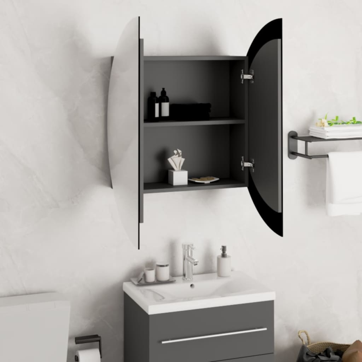 Keep your make-up essentials organised and neat with this trendy bathroom cabinet with a round mirror and a LED string! Durable material: The engineered wood is of exceptional quality with a smooth surface and also features strength, stability and resistance to moisture. Made of engineered wood, the LED mirror cabinet is easy to clean.Utility mirror: A beautiful mirror provides a view for makeup application and adds an elegant touch to the bathroom mirror cabinet.LED lights: The wall cabinet has a LED string, which is equipped with a USB interface, making it very convenient to use.Ample storage space: This jewellery mirror cabinet features large compartments, which offer places for your items and keep everything in its place.Wall-mounted design: The LED bathroom mirror cabinet can be wall-mounted. That way, you can maximise your floor space and keep the area clean. Note:Each product comes with an assembly manual in the box for easy assembly.Screw(s) and plug(s) for inside the wall are not included. Seek and use screw(s) and plug(s) suitable for your walls. If you are uncertain, seek professional advice. Read and follow each step of the instruction carefully.This has a USB connector and the 5V USB adapter is not included.