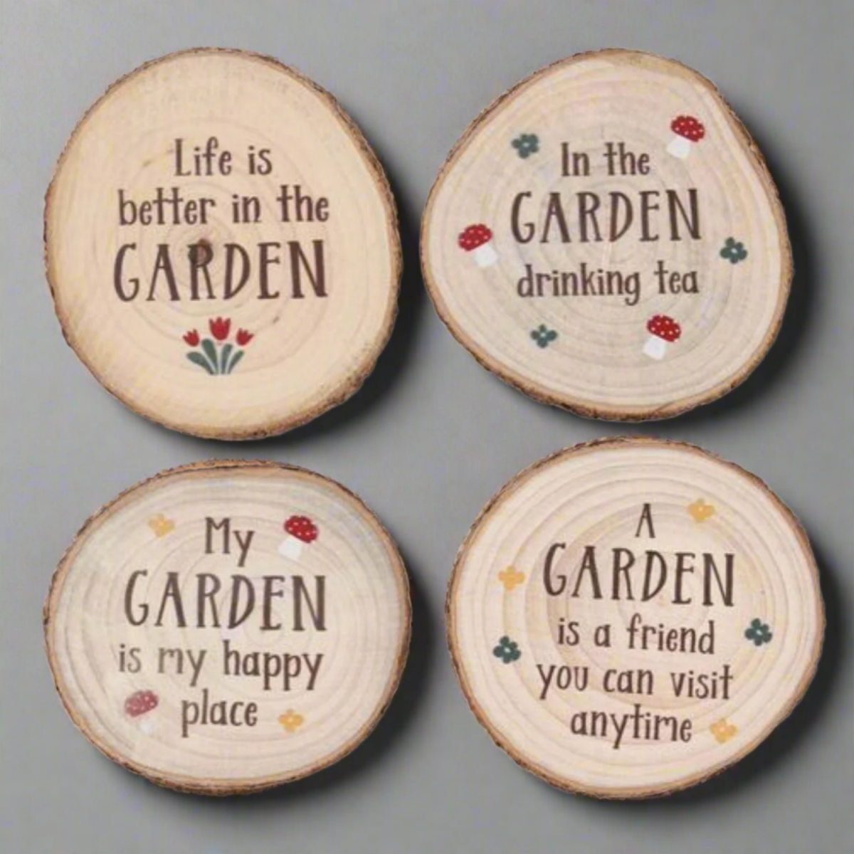 This set of four wood slice coasters is perfect for a garden dining area or summerhouse. Featuring garden quotes like 'A garden is a friend you can visit anytime' the set also makes a great gift for gardening enthusiasts. Product Dimensions: H10.5cm x W11cm x D1.2cm Packaged Dimensions: H12cm x W12cm x D6cm