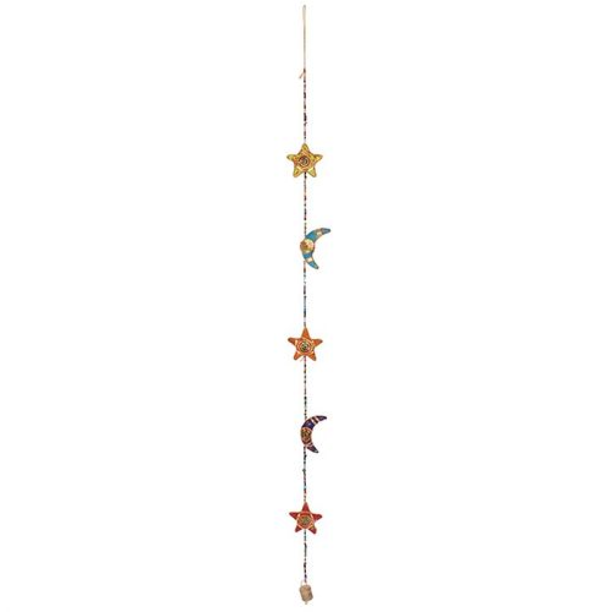 Stunning hanging decoration featuring brightly coloured and patterned moons and stars. The string is finished with multicoloured beads and a small bell. As this item is handmade, the colours and patterns may differ to those shown in the picture. Product Dimensions: H113cm x W7cm x D2.5cm Packaged Dimensions: H4cm x W17cm x D11cm