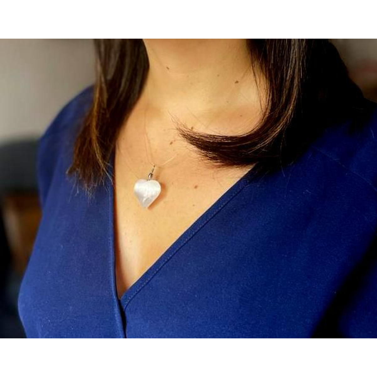Crafted from natural selenite, this heart-shaped pendant measures 4 by 2.5 cm and weighs 10 grams. Sourced from Morocco, it offers a lightweight and polished accessory suitable for everyday wear. Its smooth surface and clean lines make it a distinctive piece in your collection.