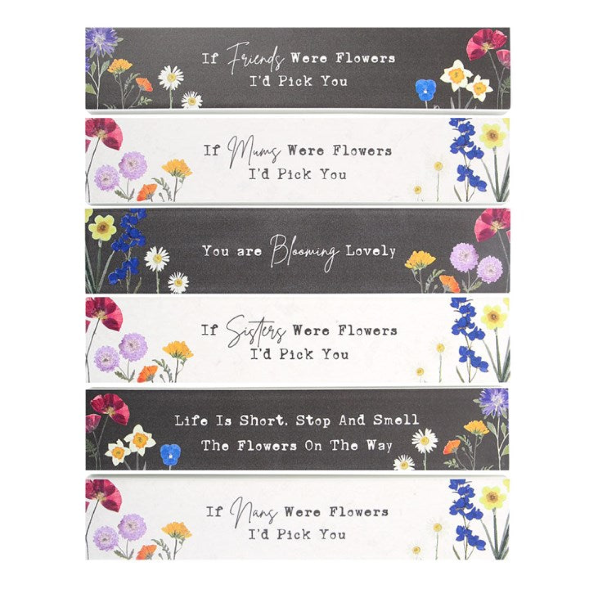 Brighten up birthdays and warm hearts on Mother's Day with this display of 36 wildflower block signs for Her. Timeless and elegant, these signs feature 6 different meaningful phrases for every special woman in one's life. Styles include, "If friends were flowers, I'd pick you", "If nans were flowers, I'd pick you", "If sisters were flowers, I'd pick you", "If mums were flowers, I'd pick you", "You are blooming lovely" and "Life is short. Stop and smell the flowers on the way" accented by lifelike wildflower designs. Sold as a set of 36 on a retail display stand, equally assorted.