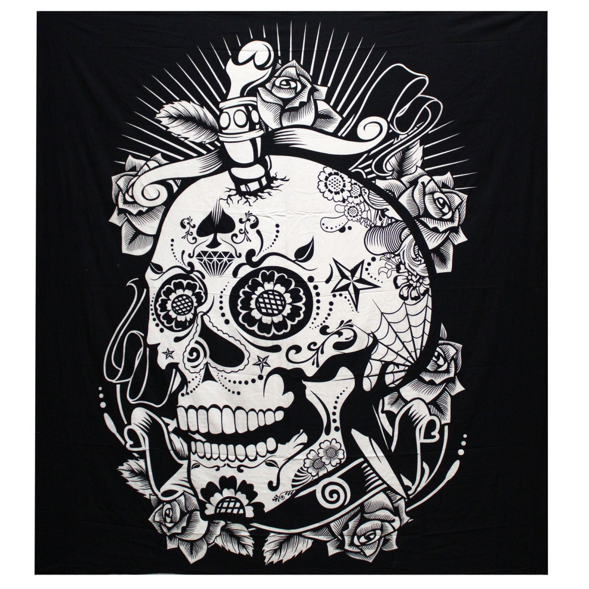 B&W Double Cotton Bedspread + Wall Hanging - Rose Skull