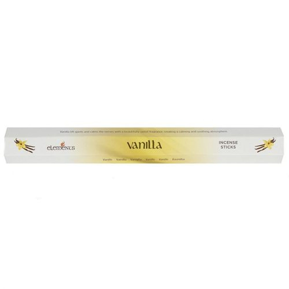 A box of 6 packs of Vanilla fragranced incense sticks by Elements. Each pack contains 20 incense sticks. Product Dimensions: H2.5cm x W24cm x D3cm Packaged Dimensions: H5.5cm x W25cm x D9cm