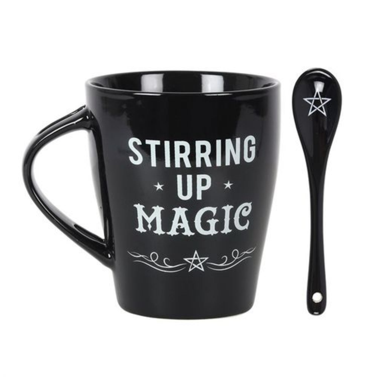 Black ceramic mug and spoon set with a 'Stirring Up Magic' design. Dishwasher and microwave safe. Product Dimensions: H10cm x W11.5cm x D8.5cm Packaged Dimensions: H10.5cm x W11.5cm x D9cm