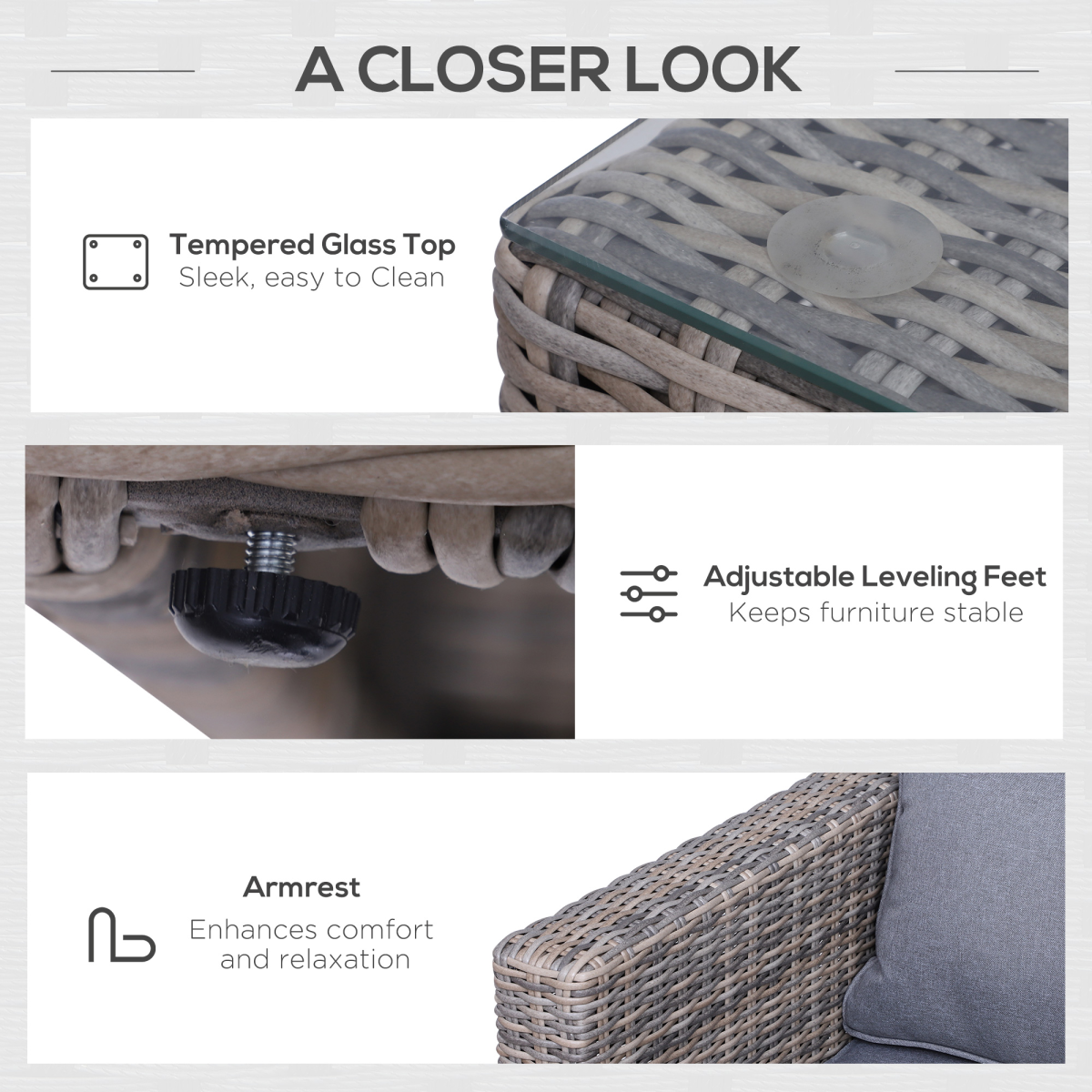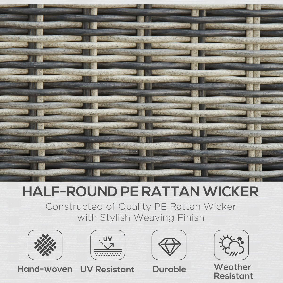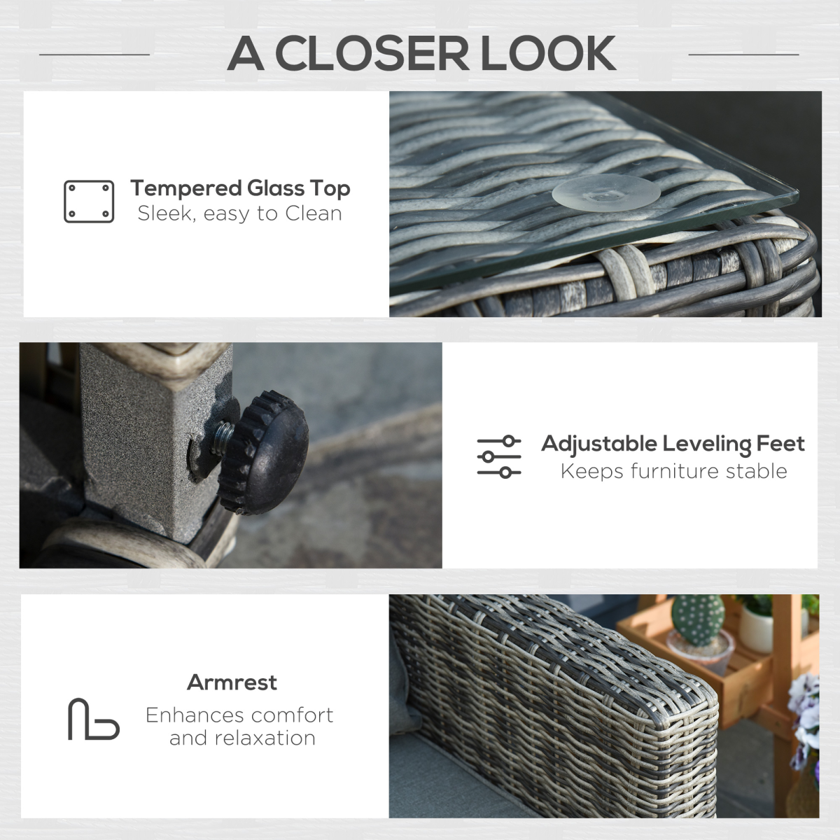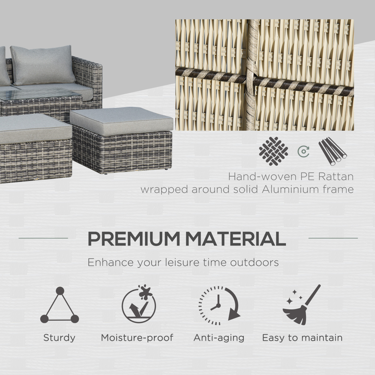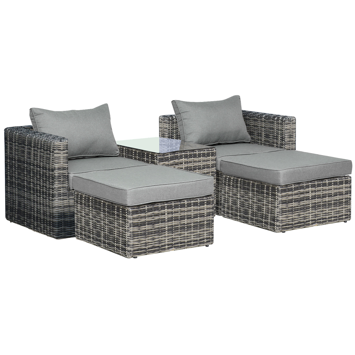 Look forward to those lazy afternoons ahead with this outdoor seating set from Outsunny. Totalling five pieces, the set includes two corner chairs, two footstools and a tall table, with solid aluminium forming the base frame for a robust structure, wrapped with PE wicker for a beautiful rattan look which is resistant to mild weathering and damage. Extra deep and wide in design to provide plenty of resting room, thick cushions are placed on the chair seats, the chair backs and the footstools for comfort, with removable and washable covers so you can keep them clean. Matching in height with the chairs, the round table is the perfect spot for keeping everything you need near, with beautiful glass surface placed on top. A set to relax under the sun for seasons to come.