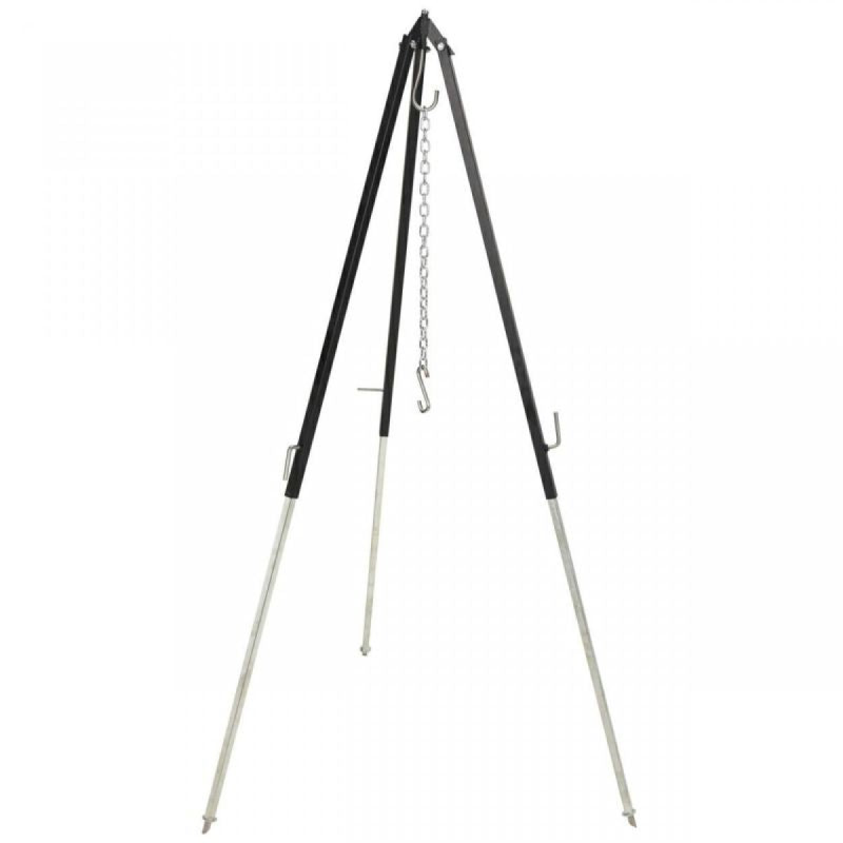 GROUND-DRIVEN ARMS - Driven arms ensure the tripod is stable and securely placed in the ground, even on uneven terrain. This prevents the stand from shifting while cooking over the fire.