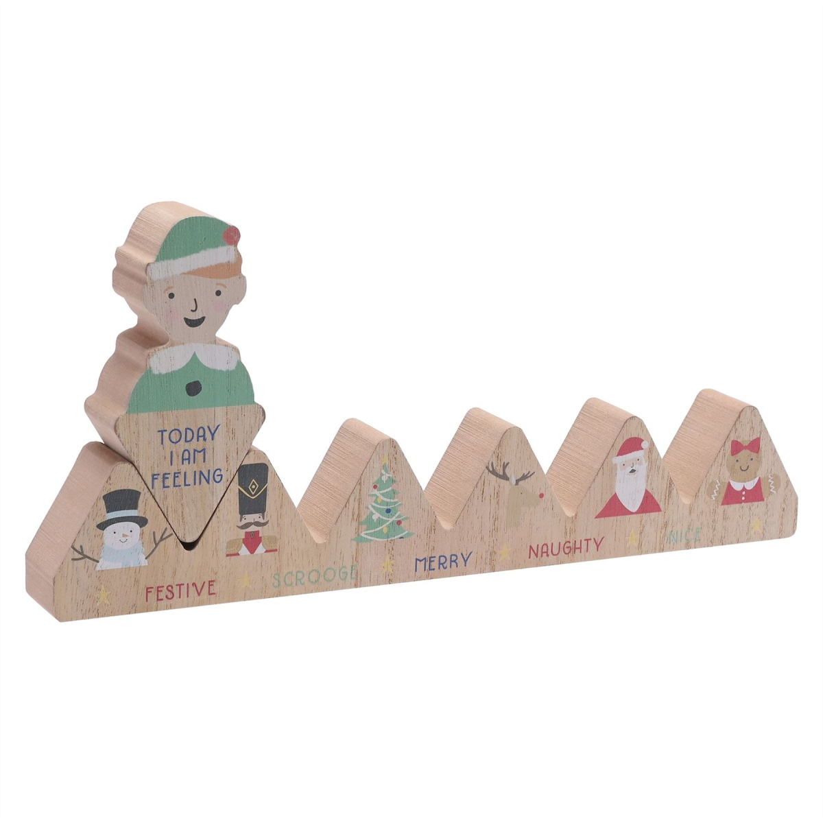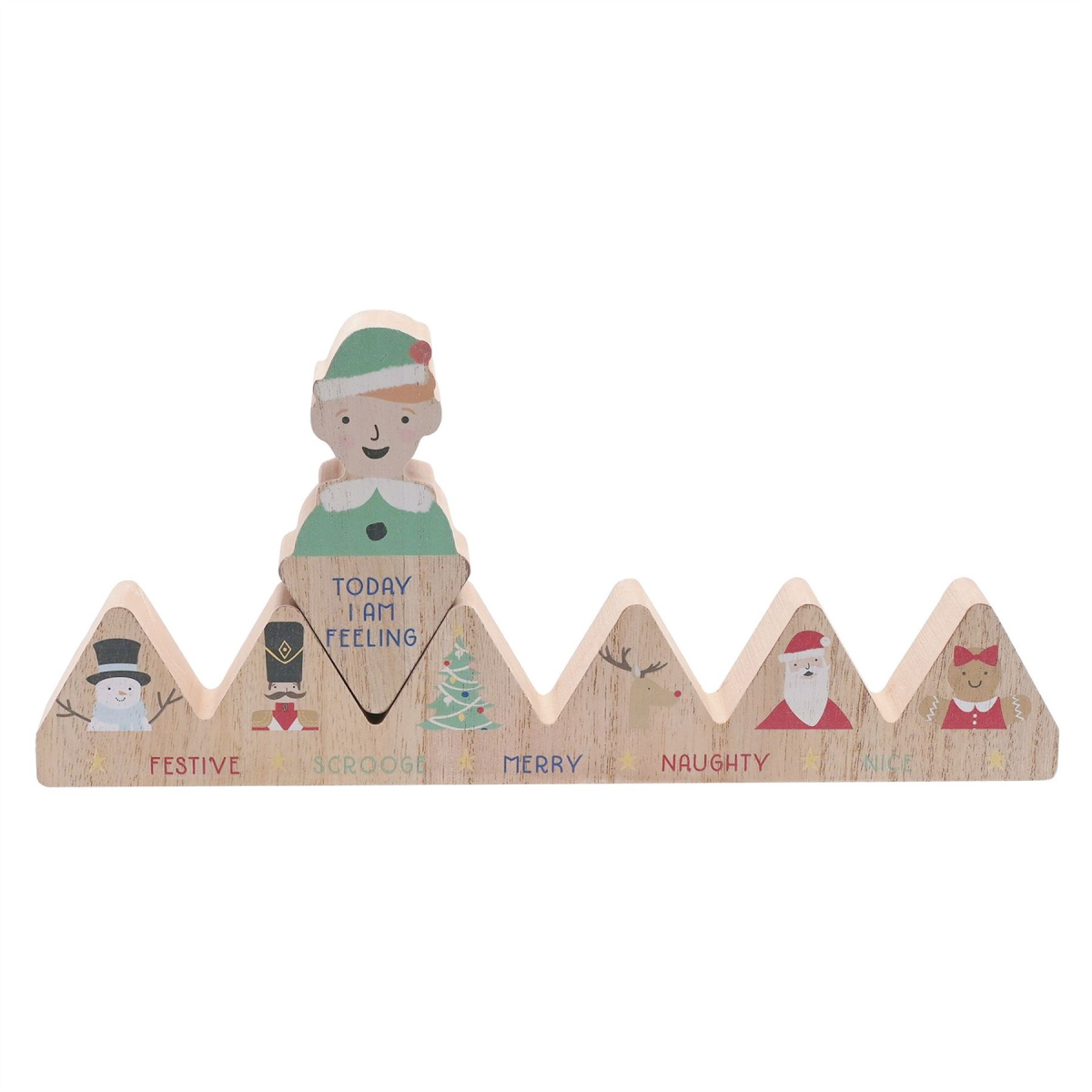 The long, wooden advent calendar showcases individually labelled festive mood peaks, along which moves a �Today I Am Feeling� elf marker to be moved each day. It is designed for freestanding display.