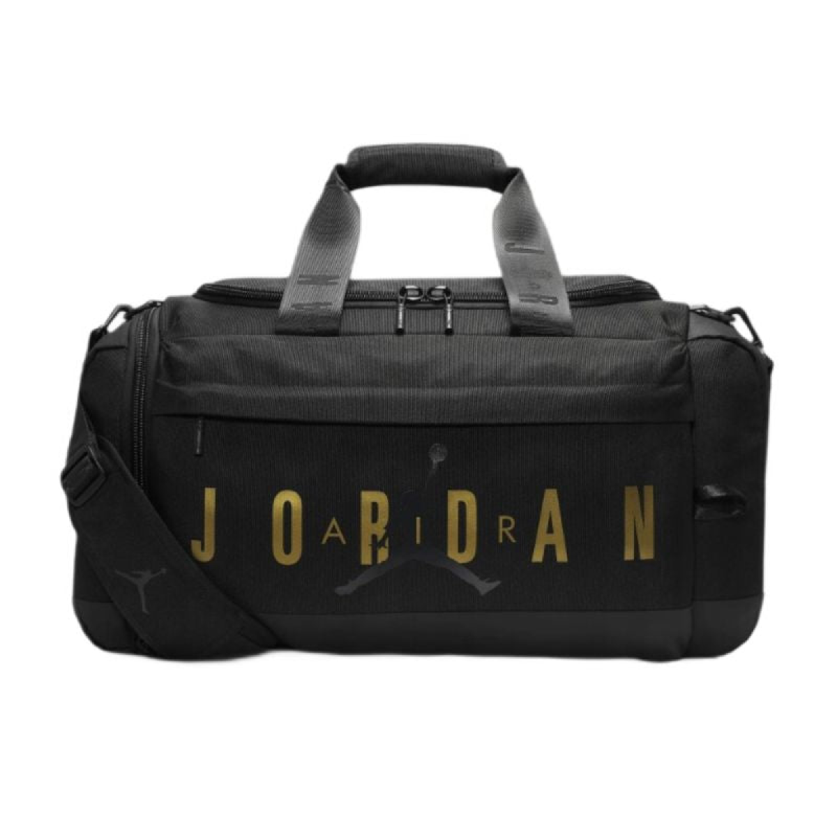 The bag's design is classic black with the distinctive gold Jordan brand logo.