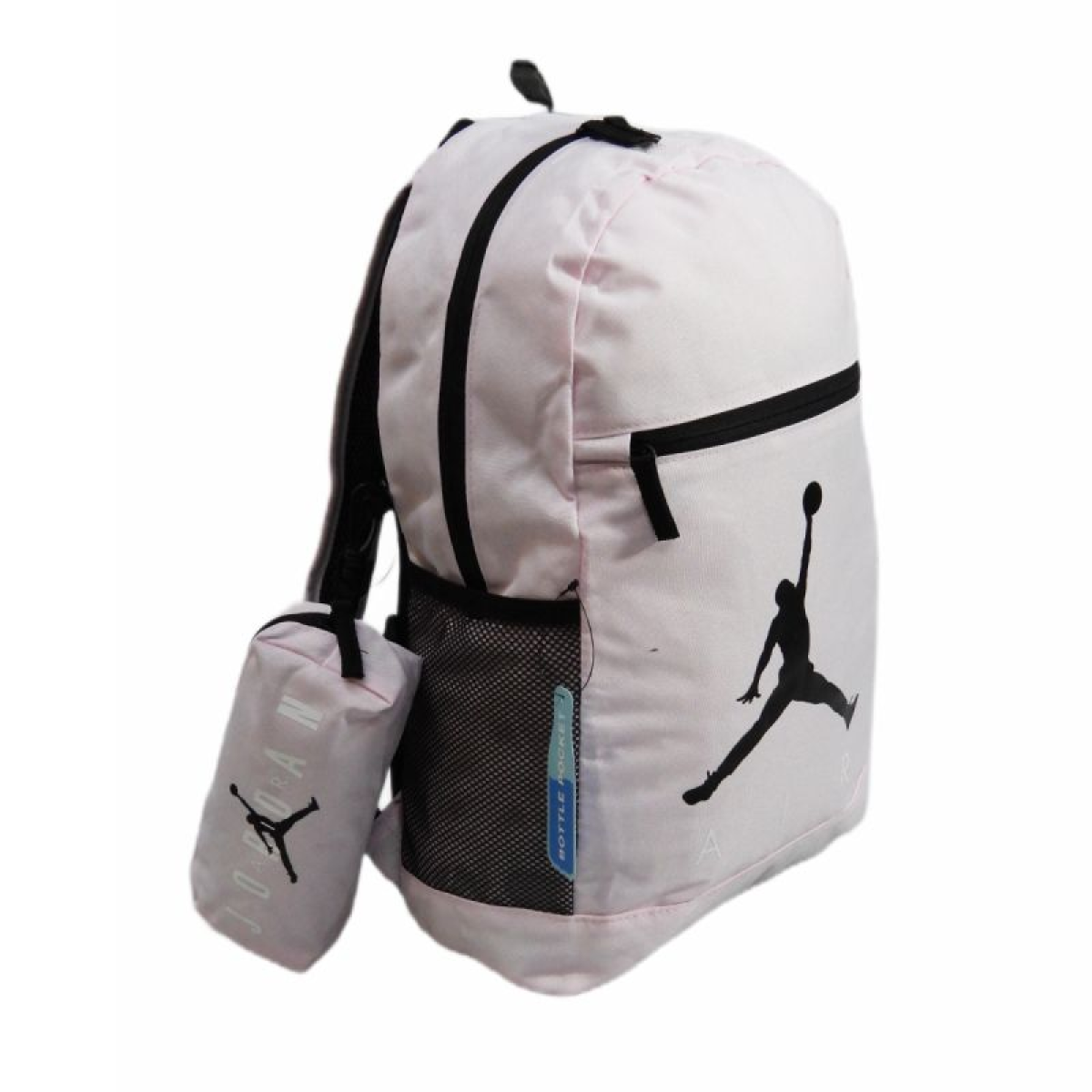 A backpack and pencil case in pink with a white Air Jordan inscription and a black Jumpman logo on the front.