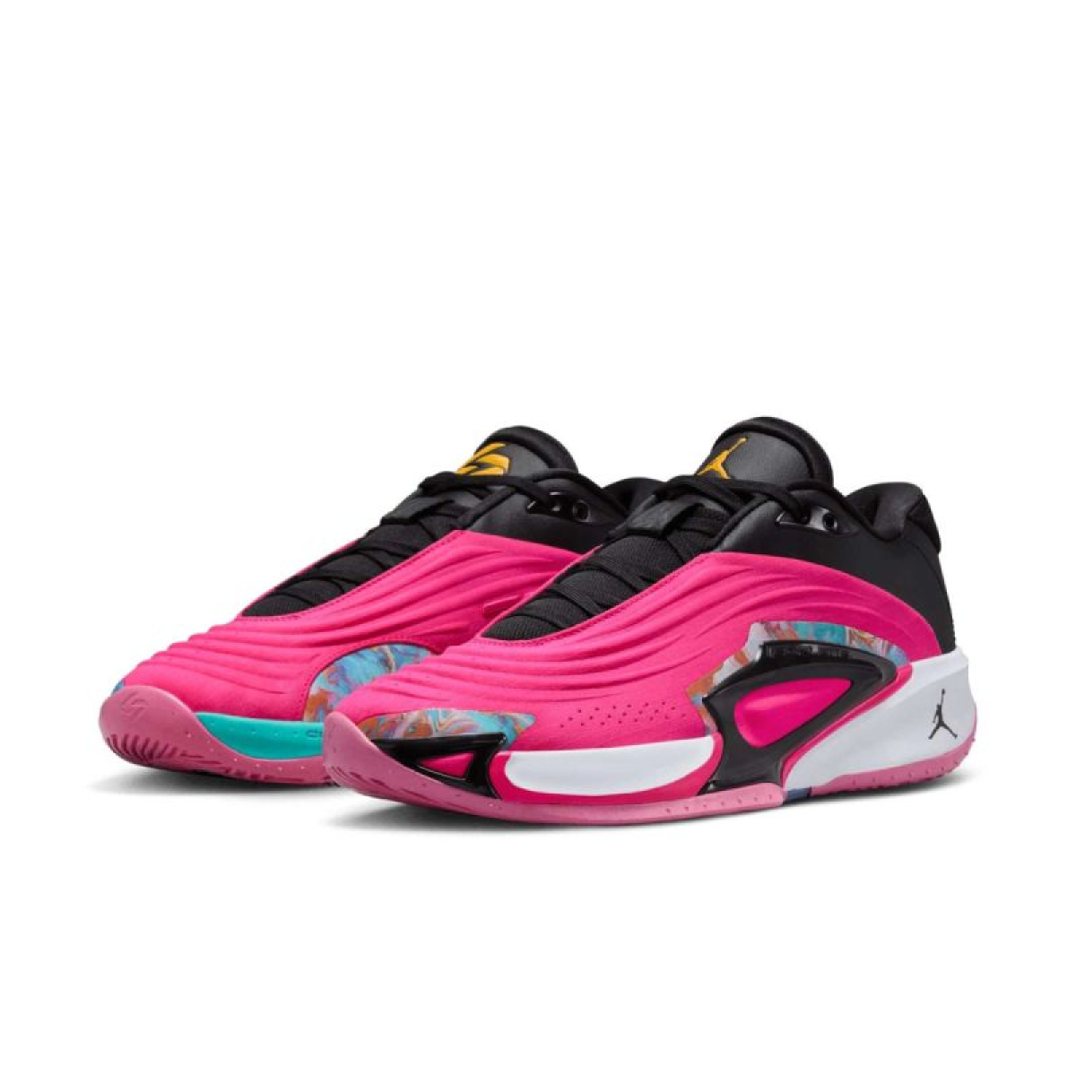 The shoe design is inspired by the automotive industry – the color scheme is Pink Prime/Black/Hyper Jade/University Gold.