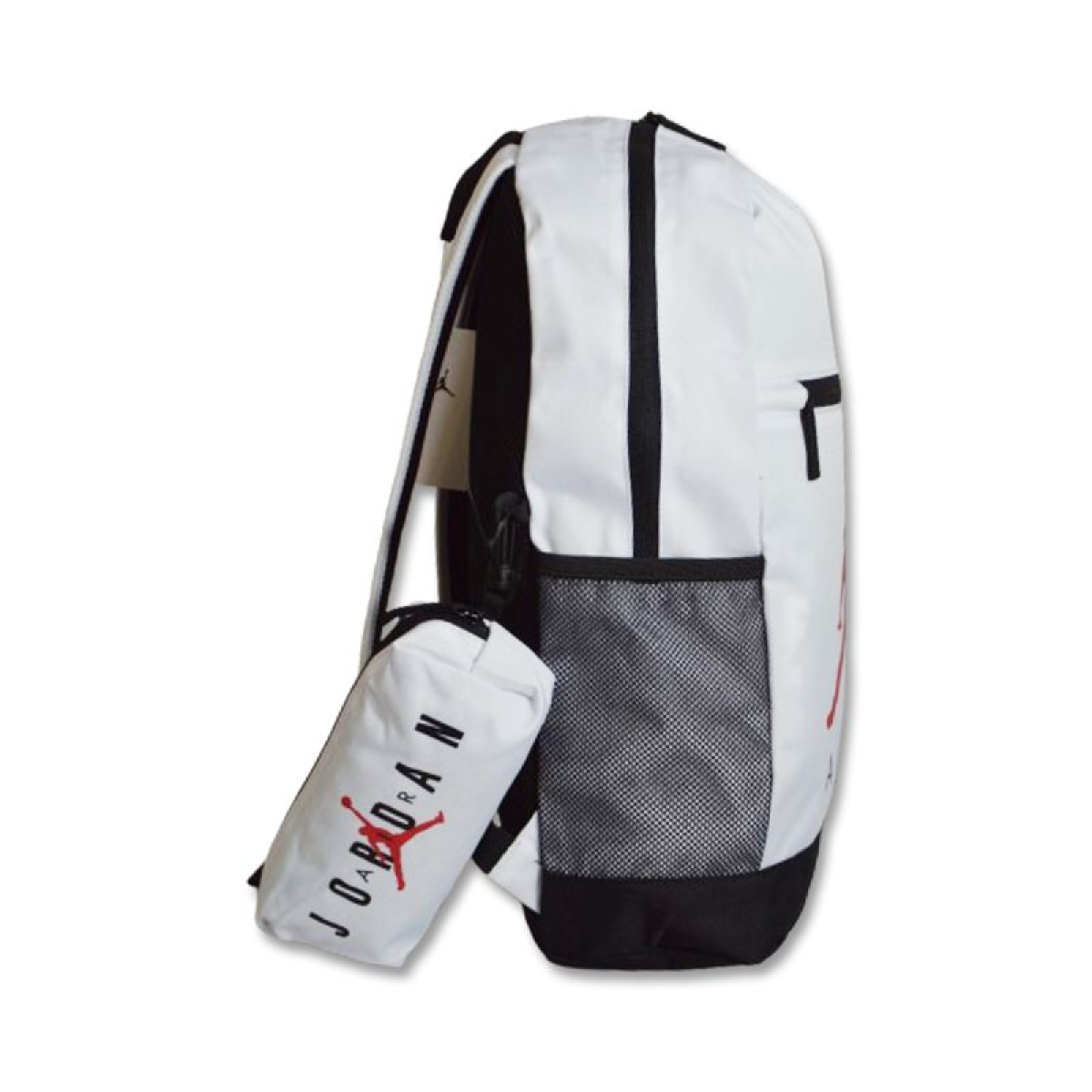 A backpack and pencil case in white with a black Air Jordan inscription and a red Jumpman logo on the front.