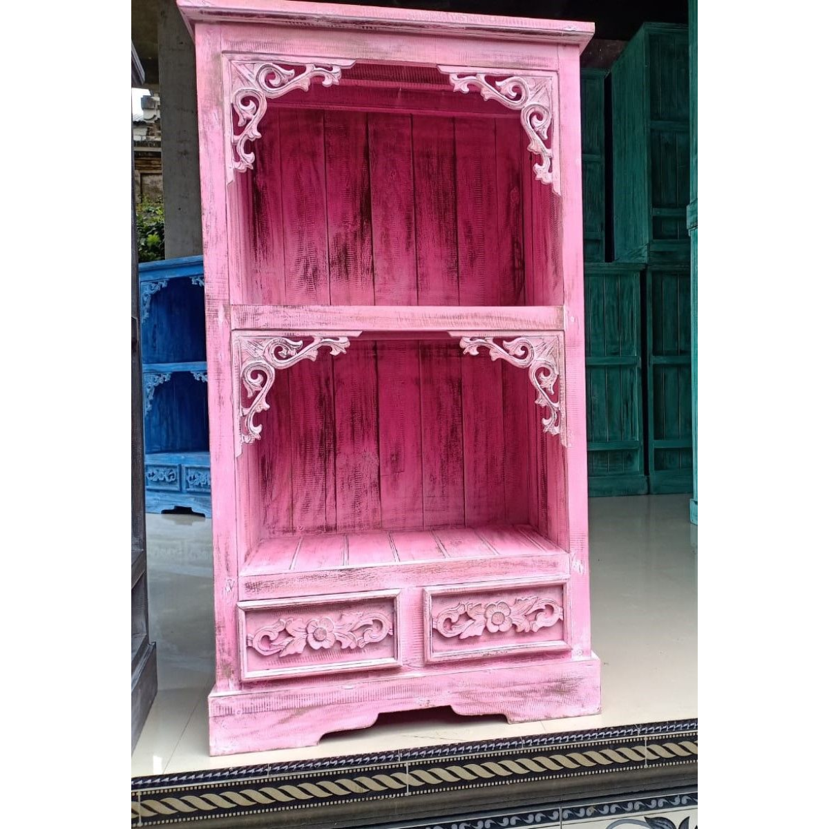 Albasia Bathroom Cabinets – Beautifully handcrafted from 100% Albasia wood, each cabinet is hand-sanded and hand-painted by skilled Balinese artisans using the finest stains. Unique corner decorations add rustic charm, while natural markings and imperfections make every piece truly one of a kind. Available in both classic, bright tones for minimalist interiors and vibrant colors to liven up any bathroom space. Designed with two shelves and spacious drawers, these cabinets provide practical storage for towels, cosmetics, and more.